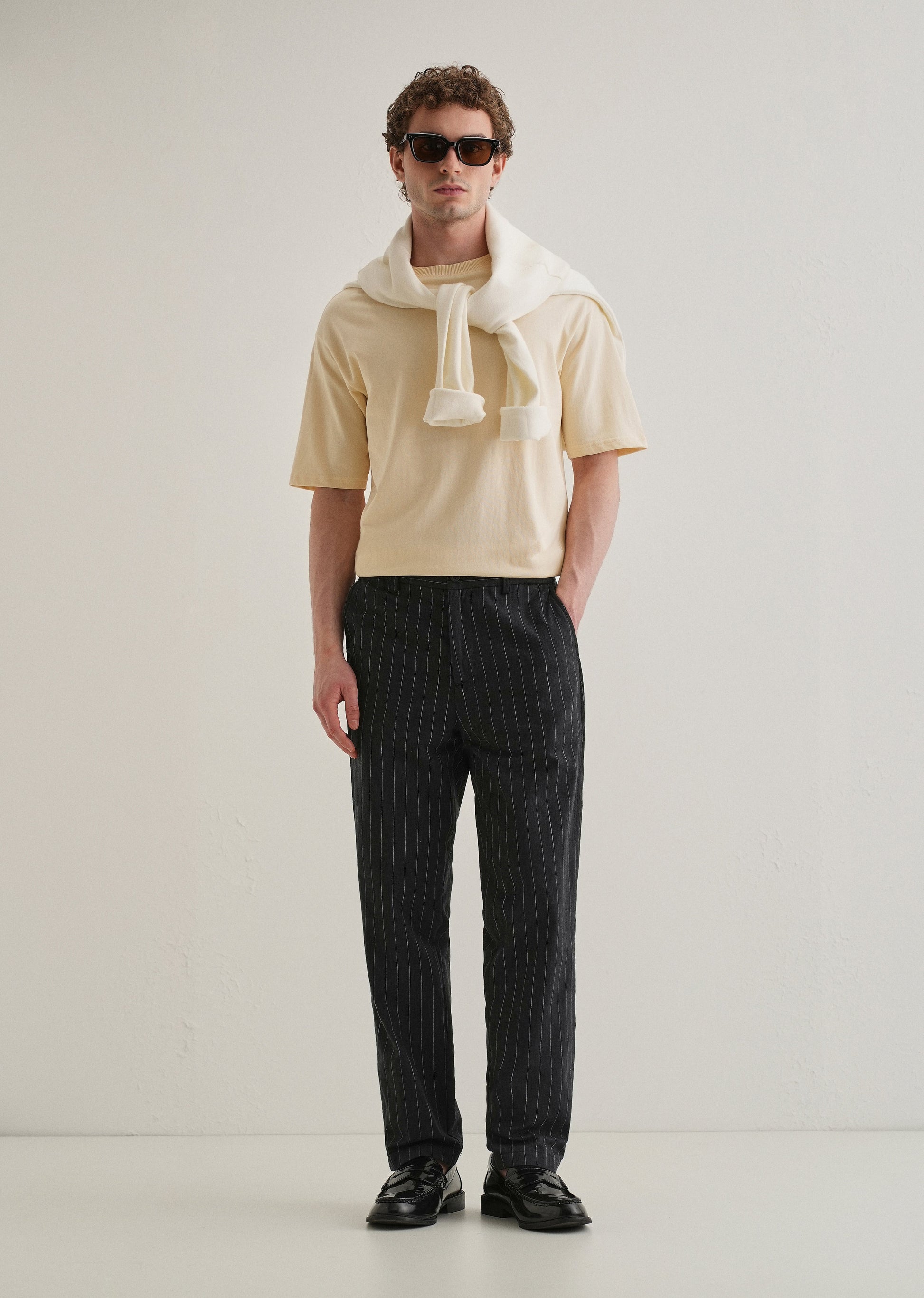 Step into effortless style with these pinstripe trousers. Tailored for comfort and a smart-casual look, they feature a relaxed fit with an adjustable drawstring waist. The soft fabric and elasticated waistband at the back to ensure all-day ease, while the classic vertical stripes add a modern, polished touch. Finished with side pockets and a back welt pocket, these trousers are perfect for both everyday wear and dressed-up occasions.