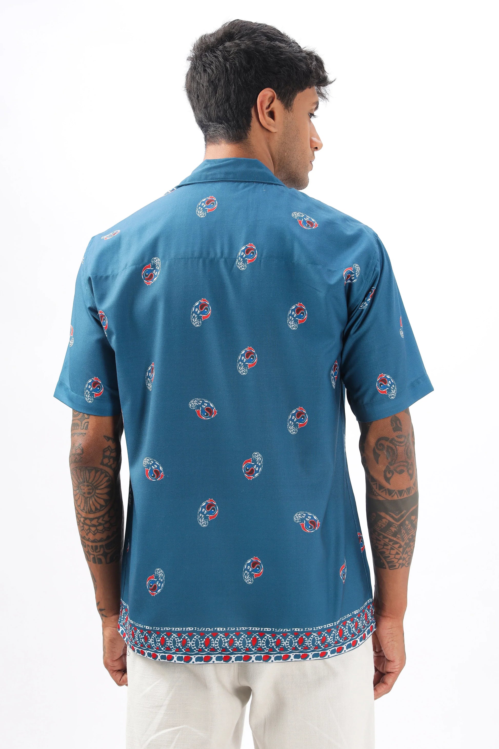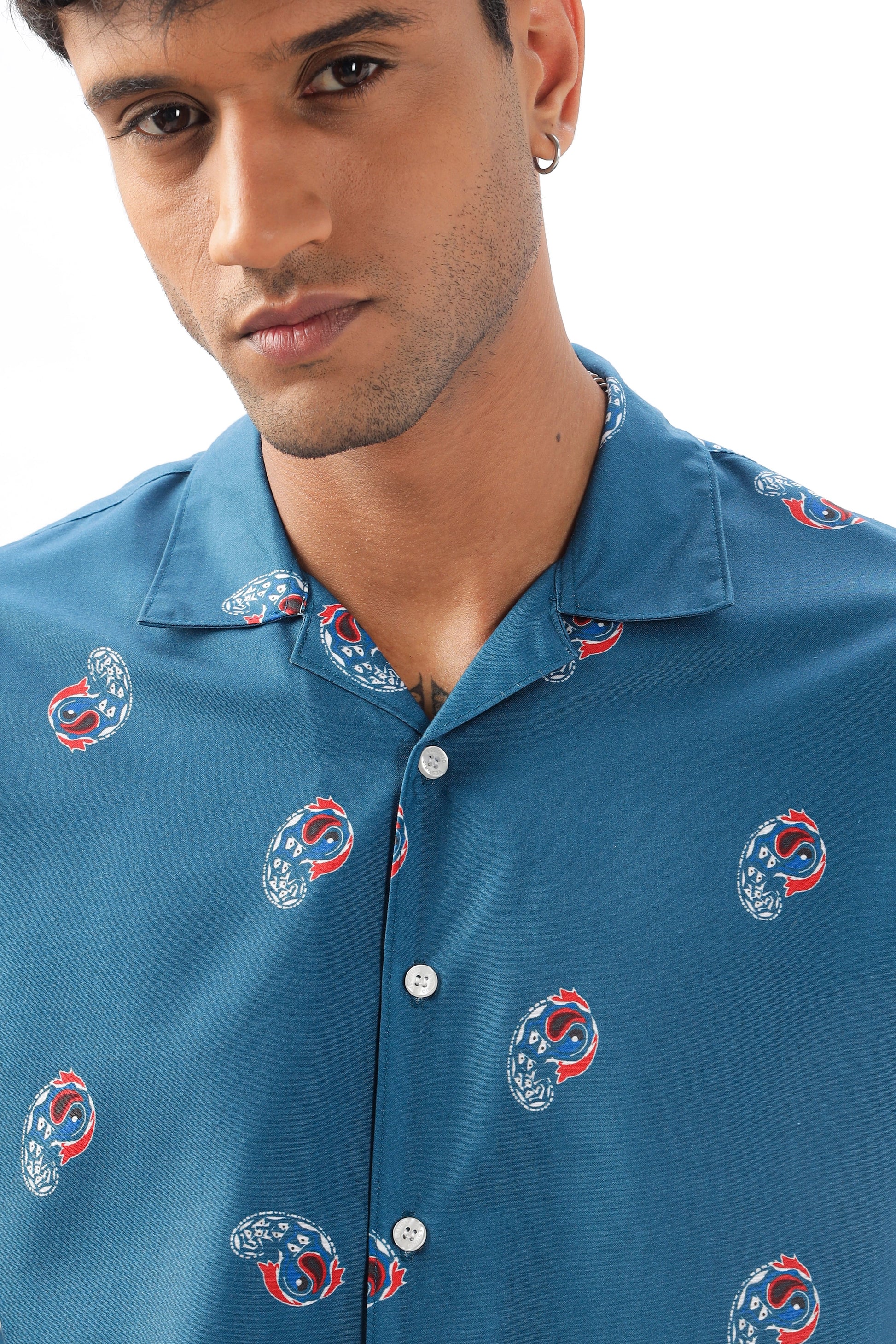 Blue paisley printed camp collar shirt