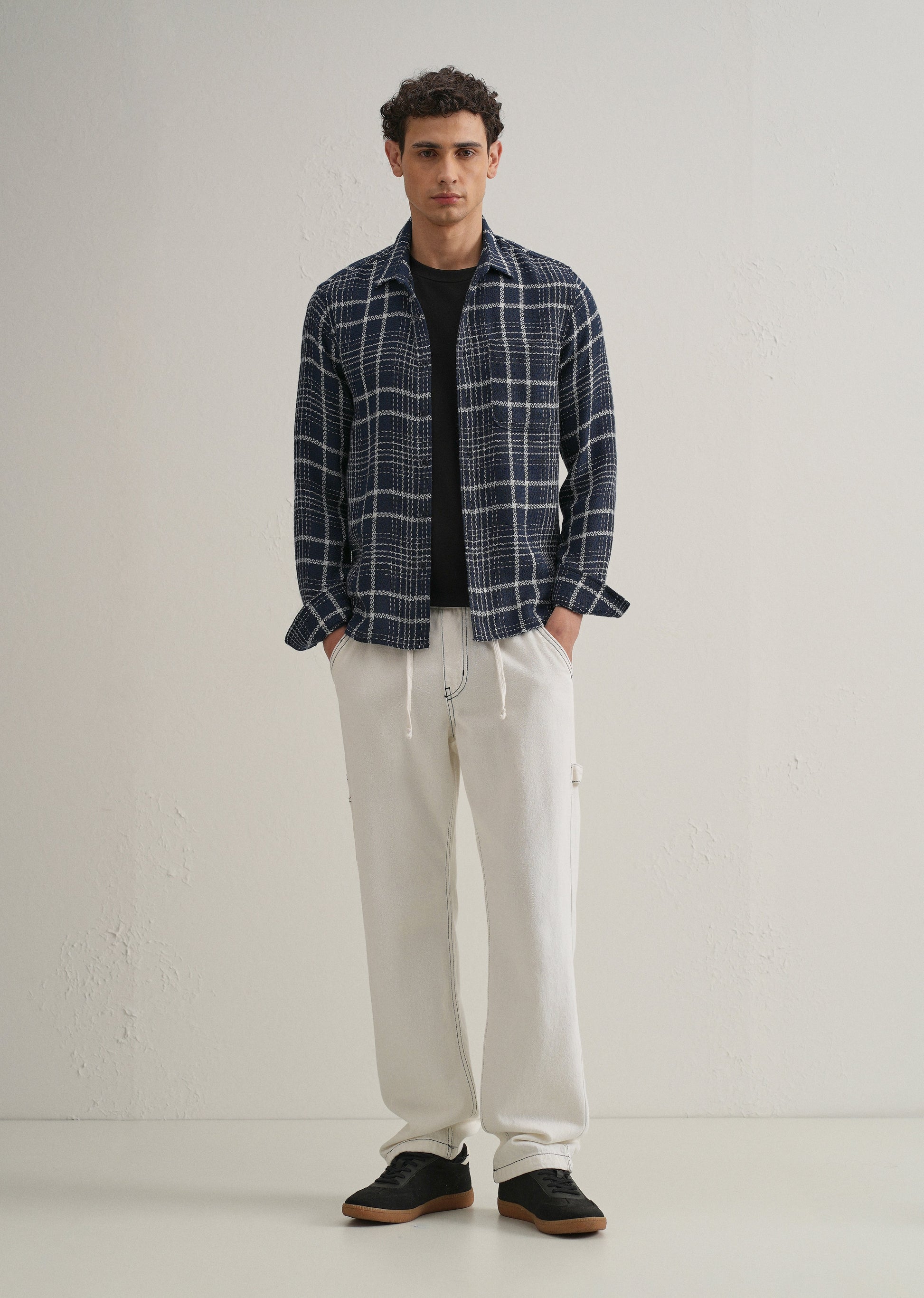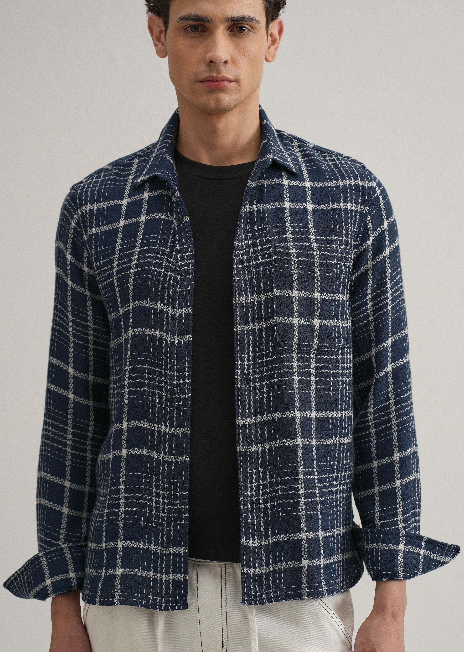 Style your everyday look with this timeless dobby weave textured check Shirt. Crafted from soft, breathable fabric, it offers all-day comfort with a classic twist. The white lines are created using supplementary weft yarns, which float over several warp threads to form the check and cross patterns. Such precise, geometric woven designs are produced on a dobby loom, which allows control over multiple warp threads to create intricate patterns.