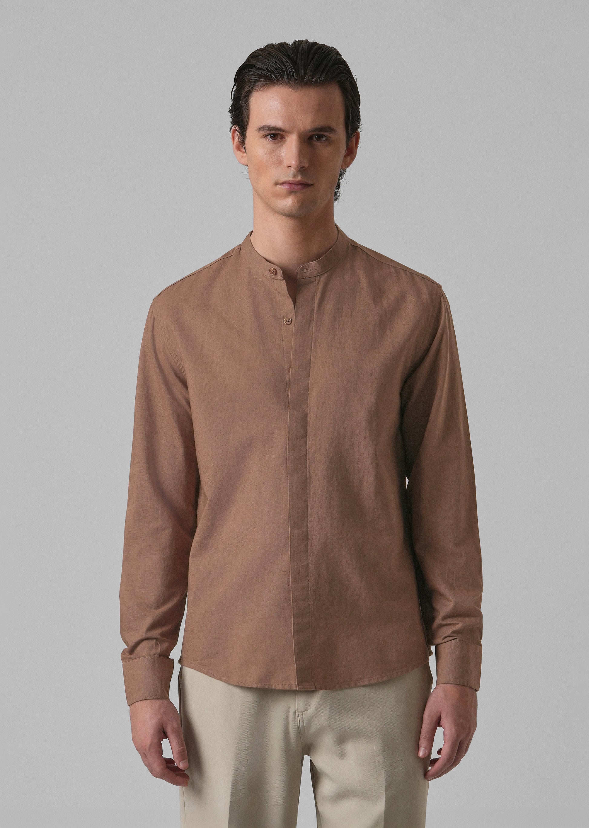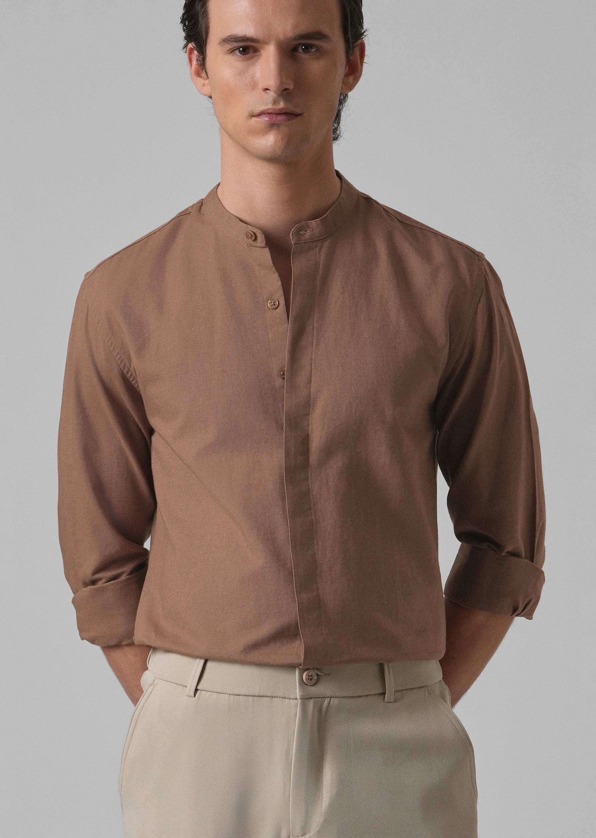 Stay sharp and comfortable with this long-sleeved shirt, designed with a mandarin collar for a clean, modern look. It features a hidden button placket for a smooth, simple front and buttoned cuffs for a neat finish. The regular fit gives you room to move while still looking smart. Made from a light, breathable mix of 68% cotton and 32% linen, it’s a great choice for warmer days and easy, everyday style.