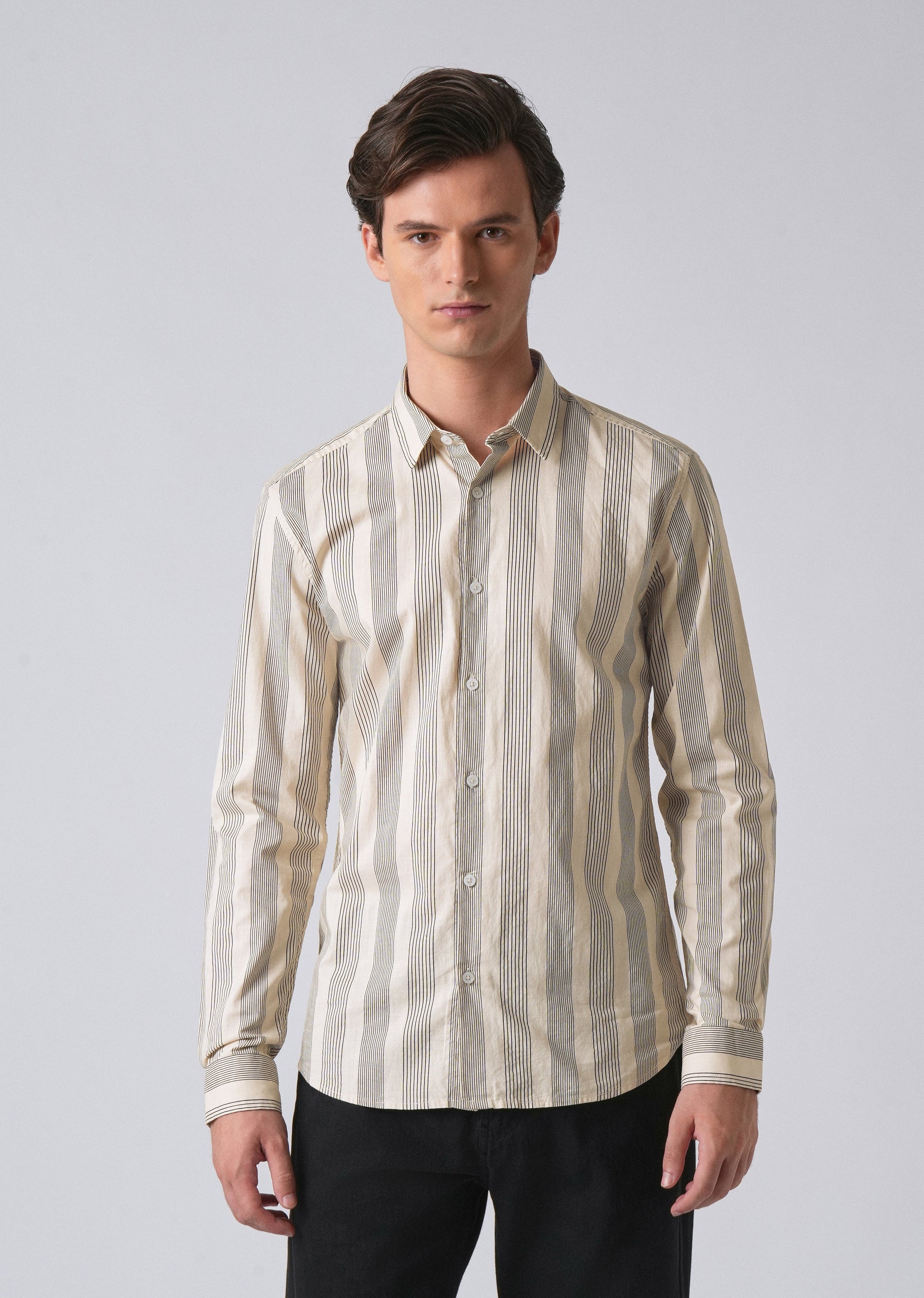 The shirt features a pattern of thin, vertical stripes in a light color, it has a classic button-up front with a normal collar and long sleeves. The fit appears to be slim, giving the shirt a modern and eye-catching look.