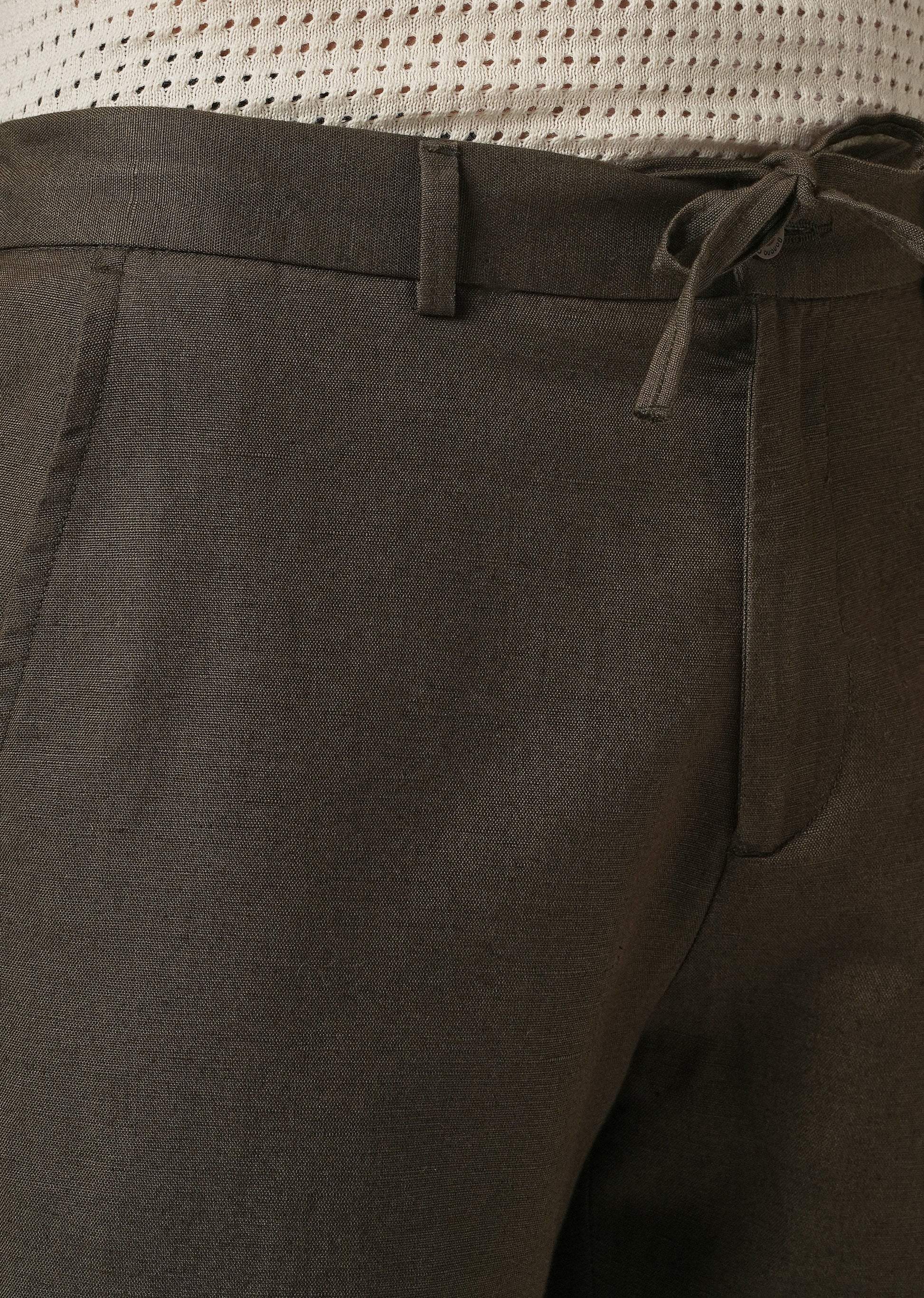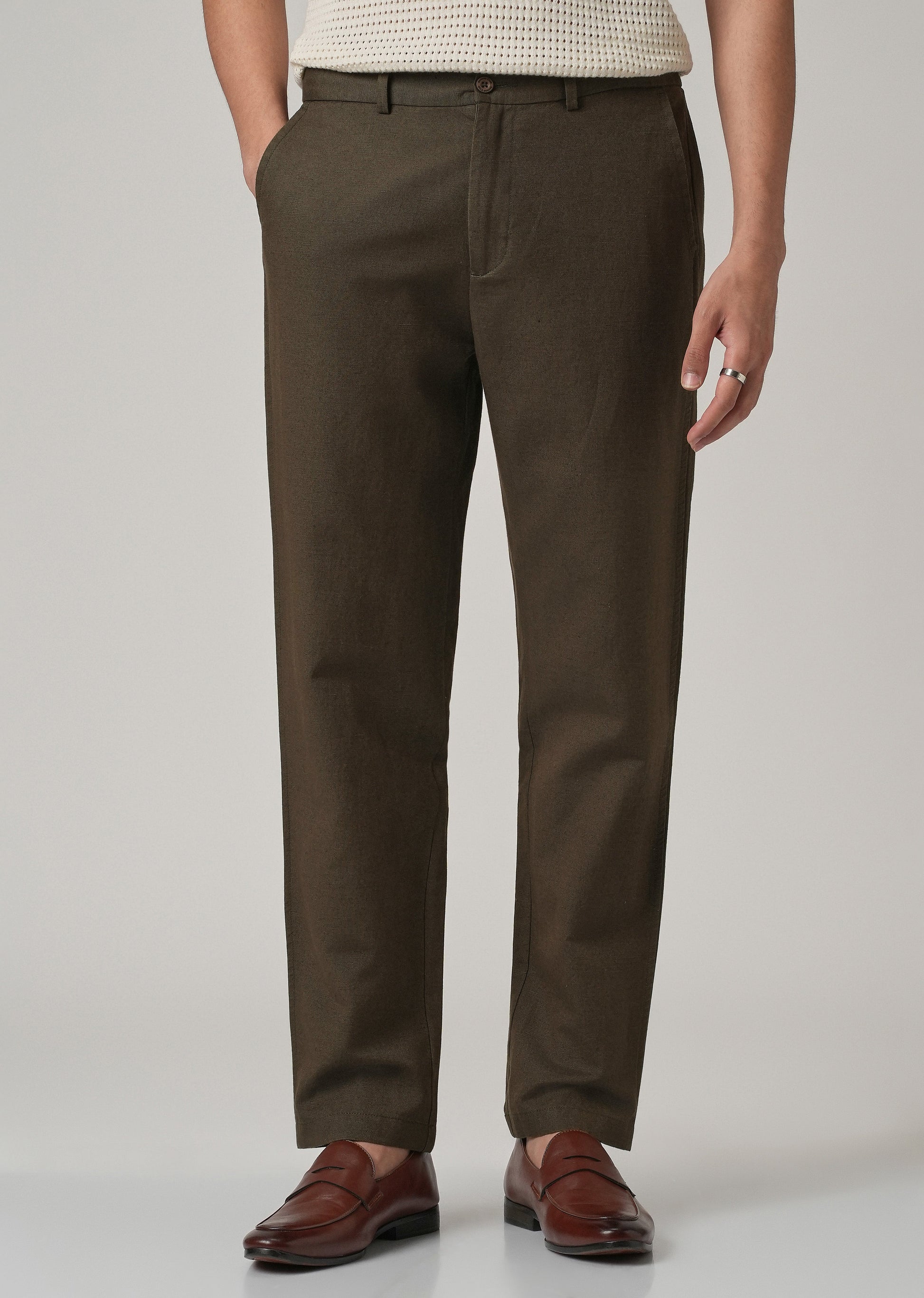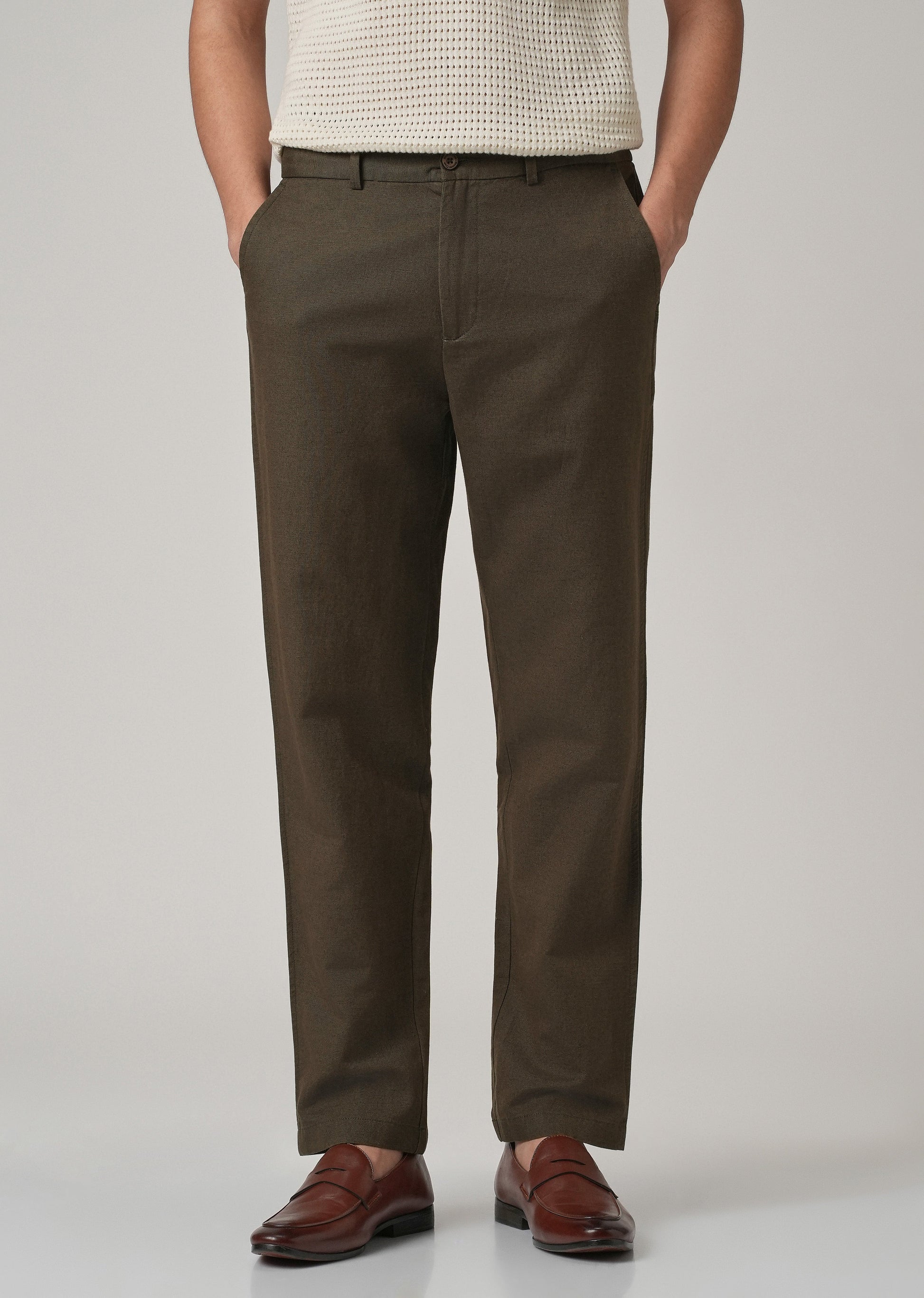 These versatile trousers feature a semi-elasticated waistband for added comfort and a button closure with belt loops for a personalized fit. With two side pockets and two welt pockets at the back. The relaxed fit offers comfortable feel.