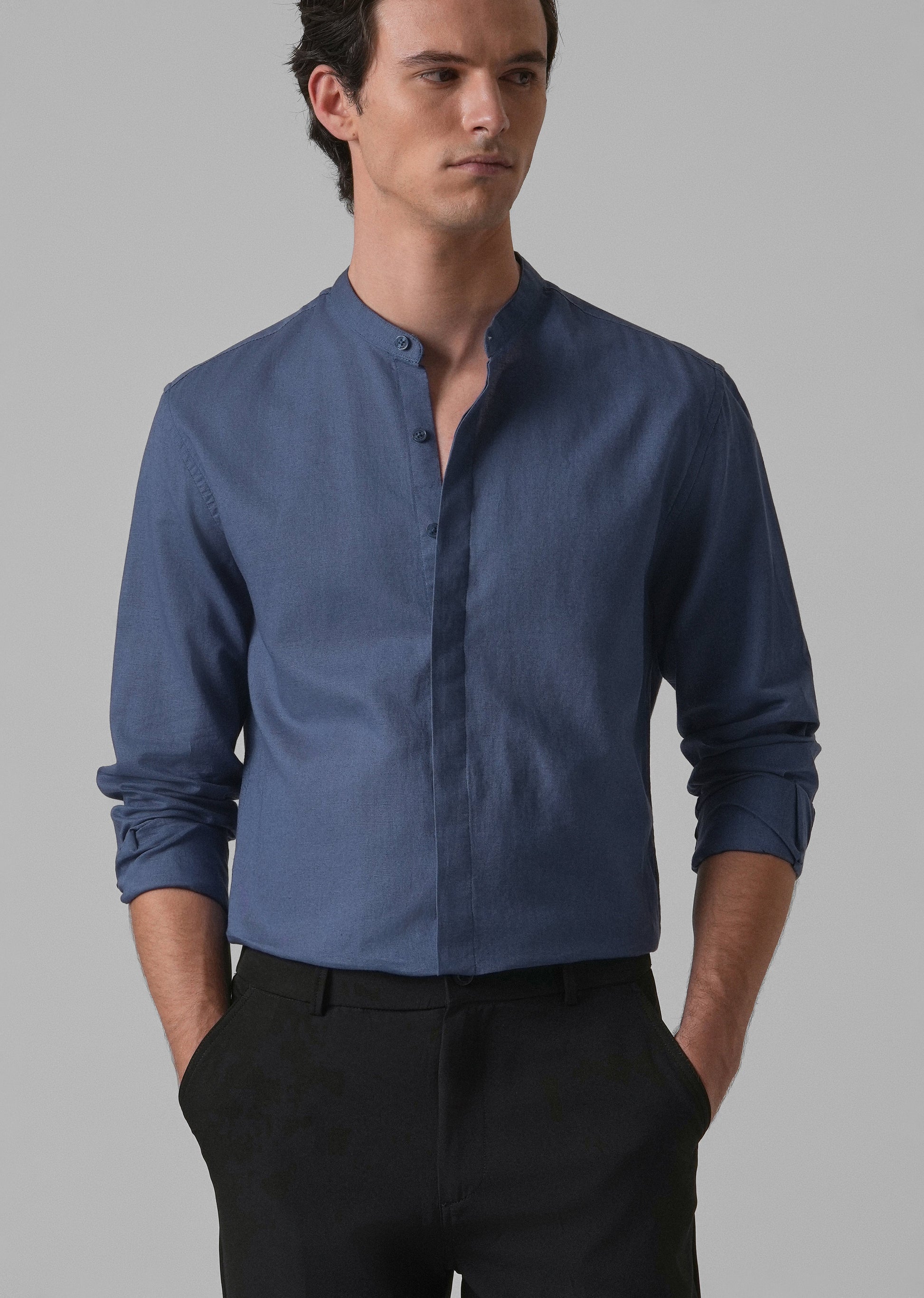 Stay sharp and comfortable with this long-sleeved shirt, designed with a mandarin collar for a clean, modern look. It features a hidden button placket for a smooth, simple front and buttoned cuffs for a neat finish. The regular fit gives you room to move while still looking smart. Made from a light, breathable mix of 68% cotton and 32% linen, it’s a great choice for warmer days and easy, everyday style.