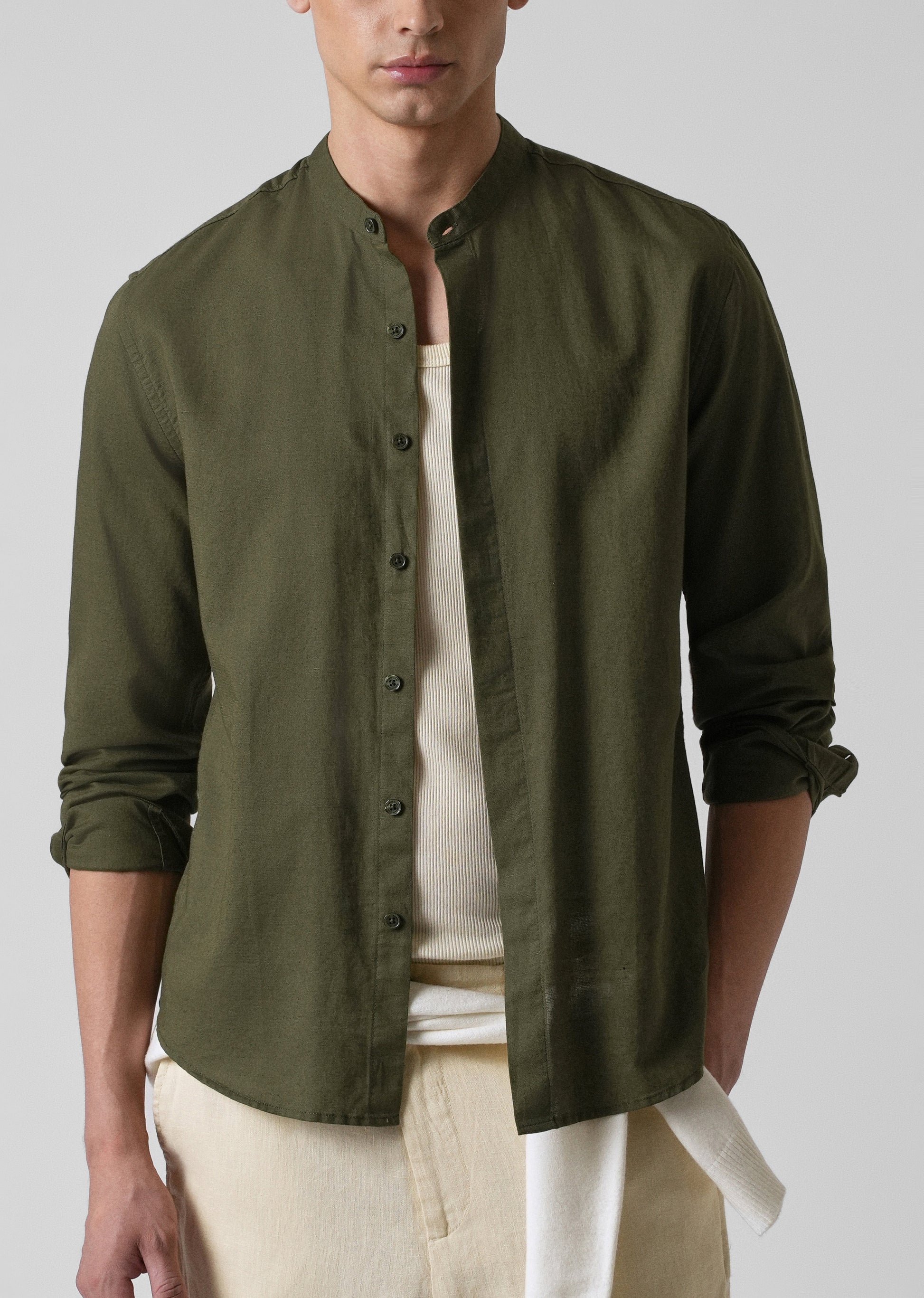 Stay sharp and comfortable with this long-sleeved shirt, designed with a mandarin collar for a clean, modern look. It features a hidden button placket for a smooth, simple front and buttoned cuffs for a neat finish. The regular fit gives you room to move while still looking smart. Made from a light, breathable mix of 68% cotton and 32% linen, it’s a great choice for warmer days and easy, everyday style.