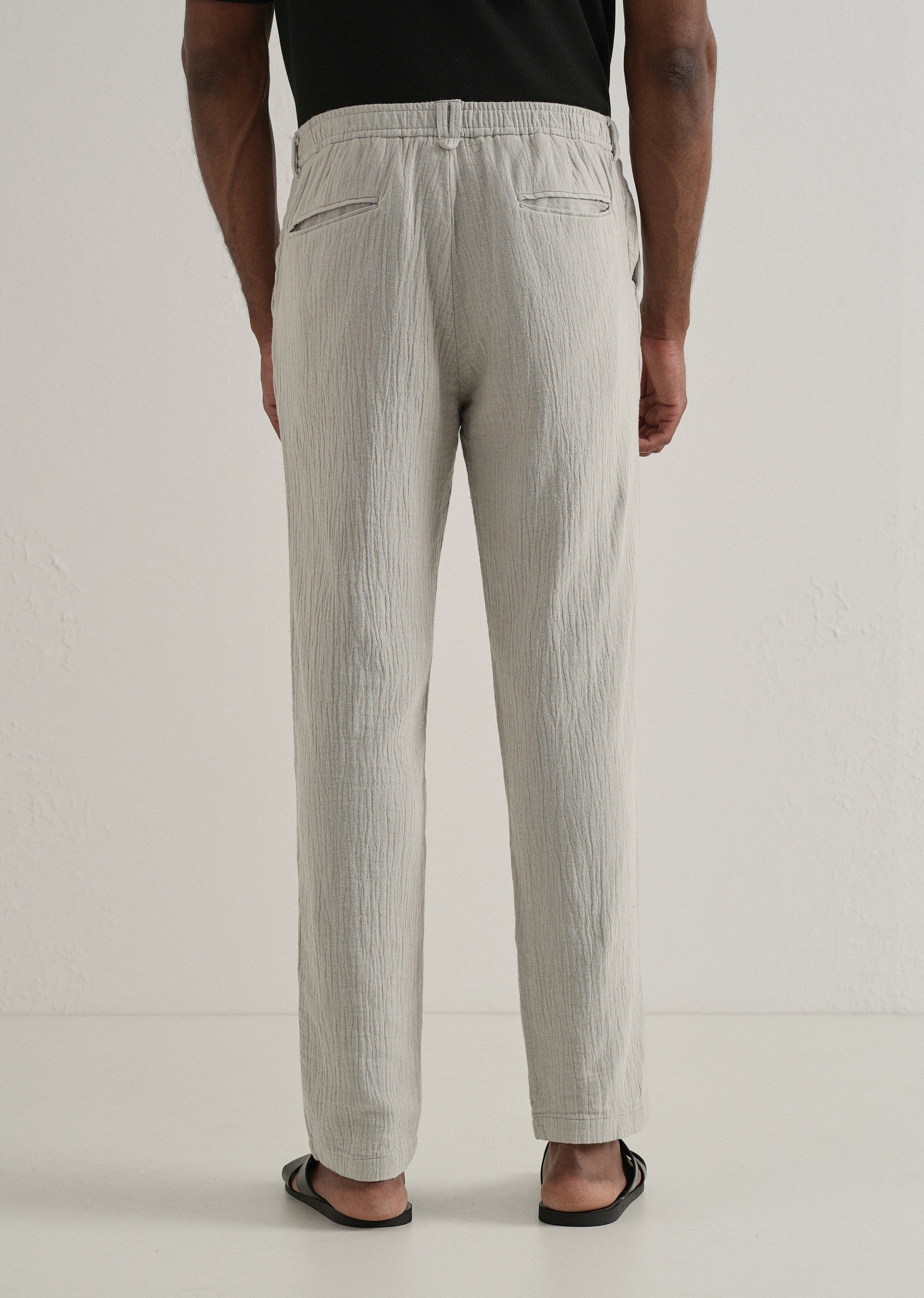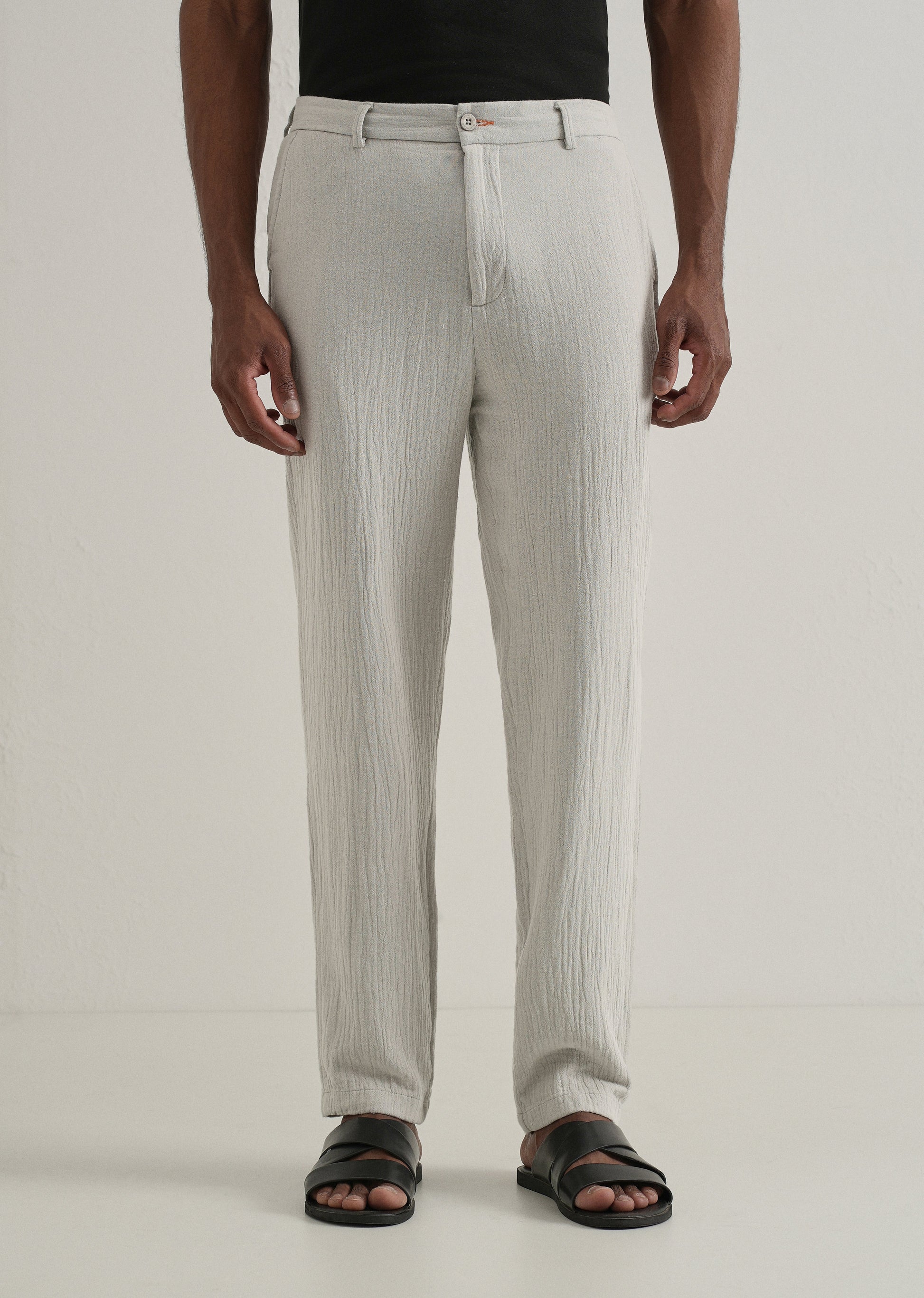 Step into comfort and style with these textured trousers, designed for a perfect balance of comfort and sophistication. Made from lightweight, breathable fabric with a crinkled effect, these trousers feature a mid-rise waist, button-and-zip closure, and belt loops for versatile styling. The straight relaxed fit ensures all-day comfort, while the welt pockets at the back add a clean, tailored finish. These trousers effortlessly blend style and functionality.