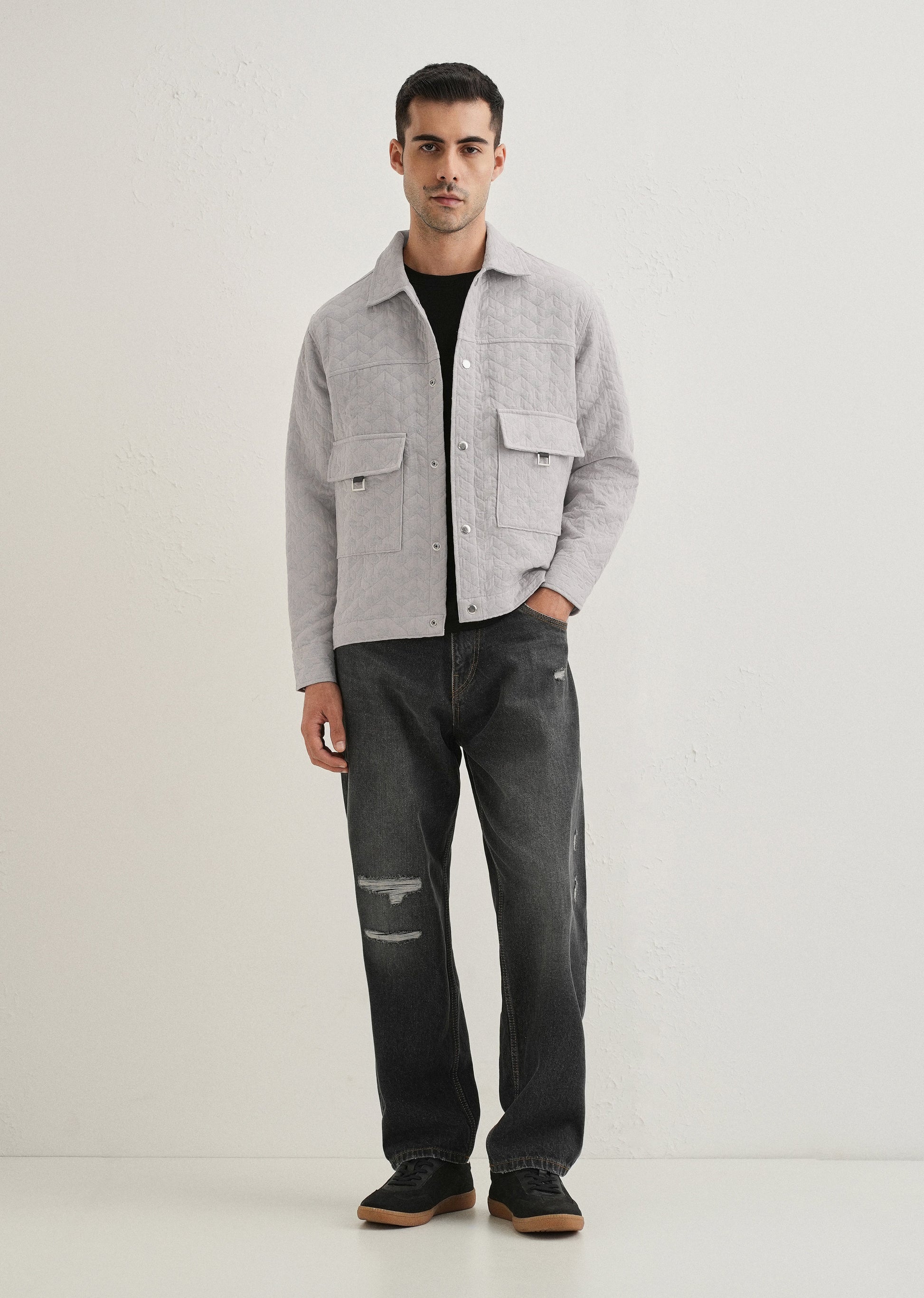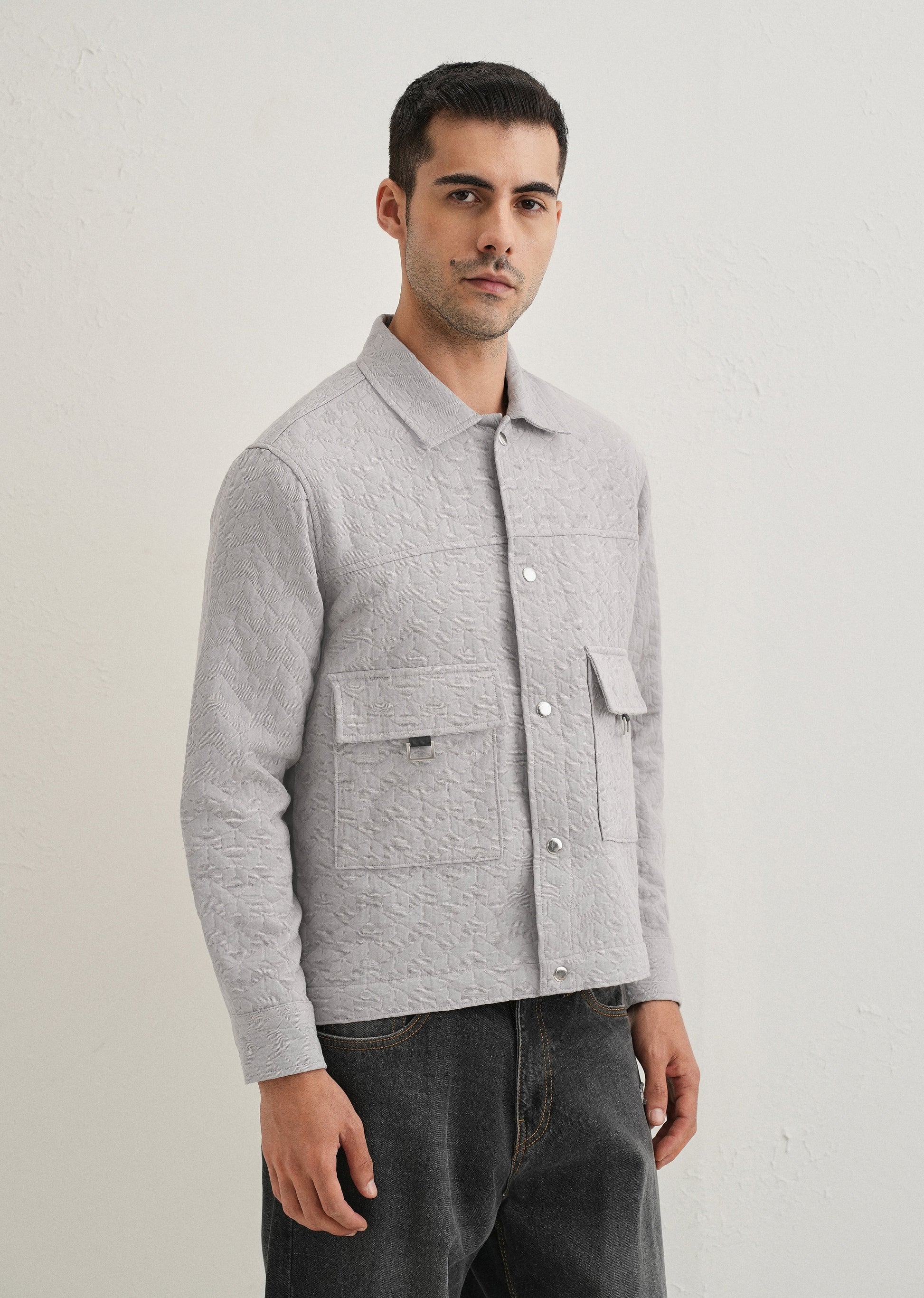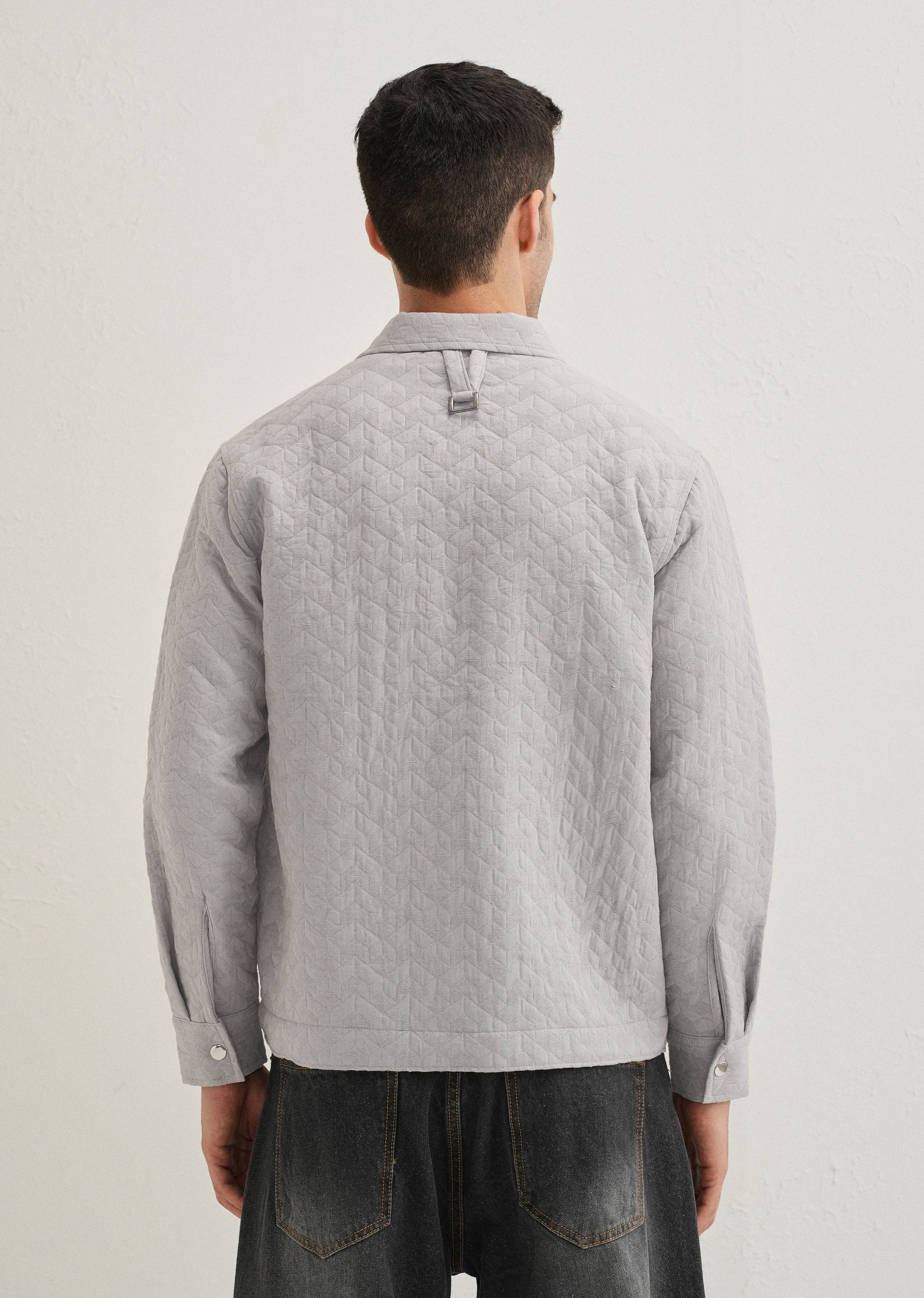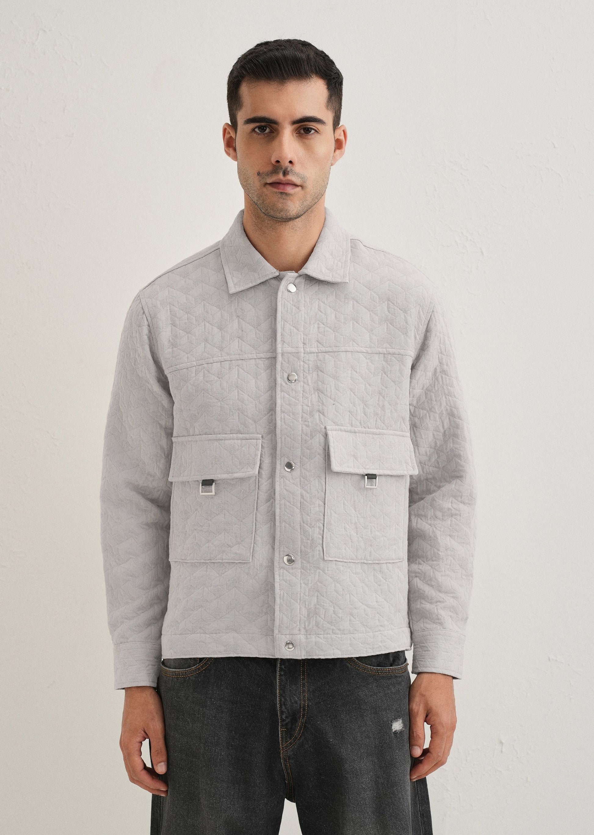 Structured boxy-fit shacket with a standard point collar and straight hem. Made from blended cotton with a geometric textured pattern. Features visible metal snap buttons down the front and two functional flap chest pockets secured with silver snaps for a clean, utilitarian look.