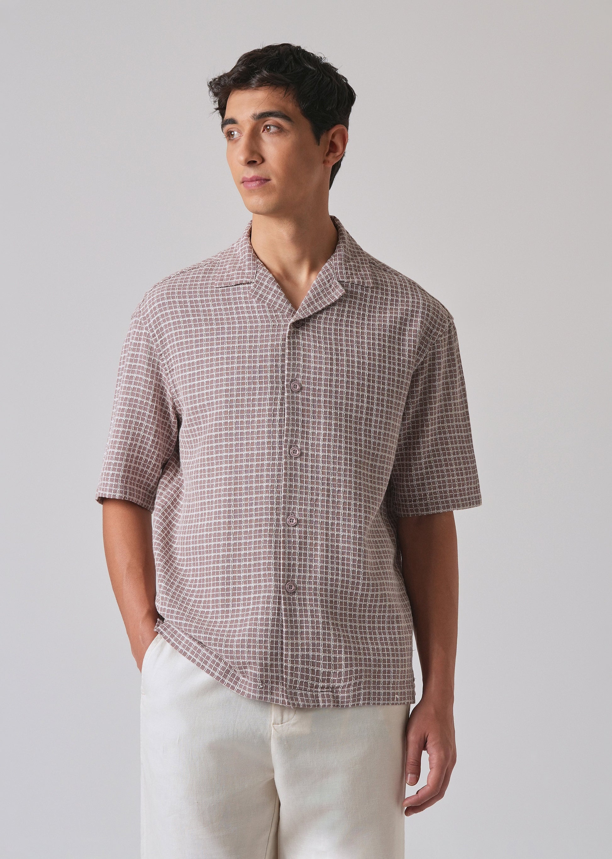 This shirt is a drop shoulder-sleeved button-up style, featuring an open and laid flat Cuban collar. It showcases a distinctive chenille check pattern and has a full button placket down the front. 100% cotton fabric. The design is completed with a straight hemline and an oversized fit.