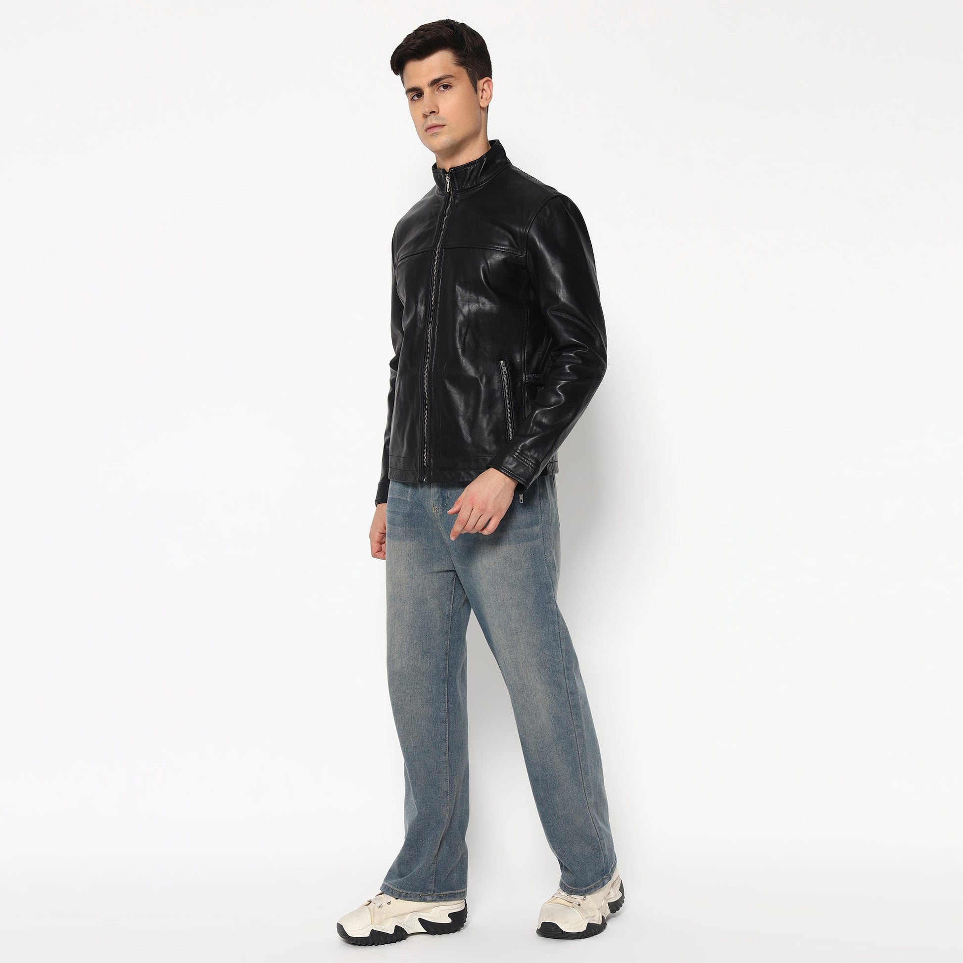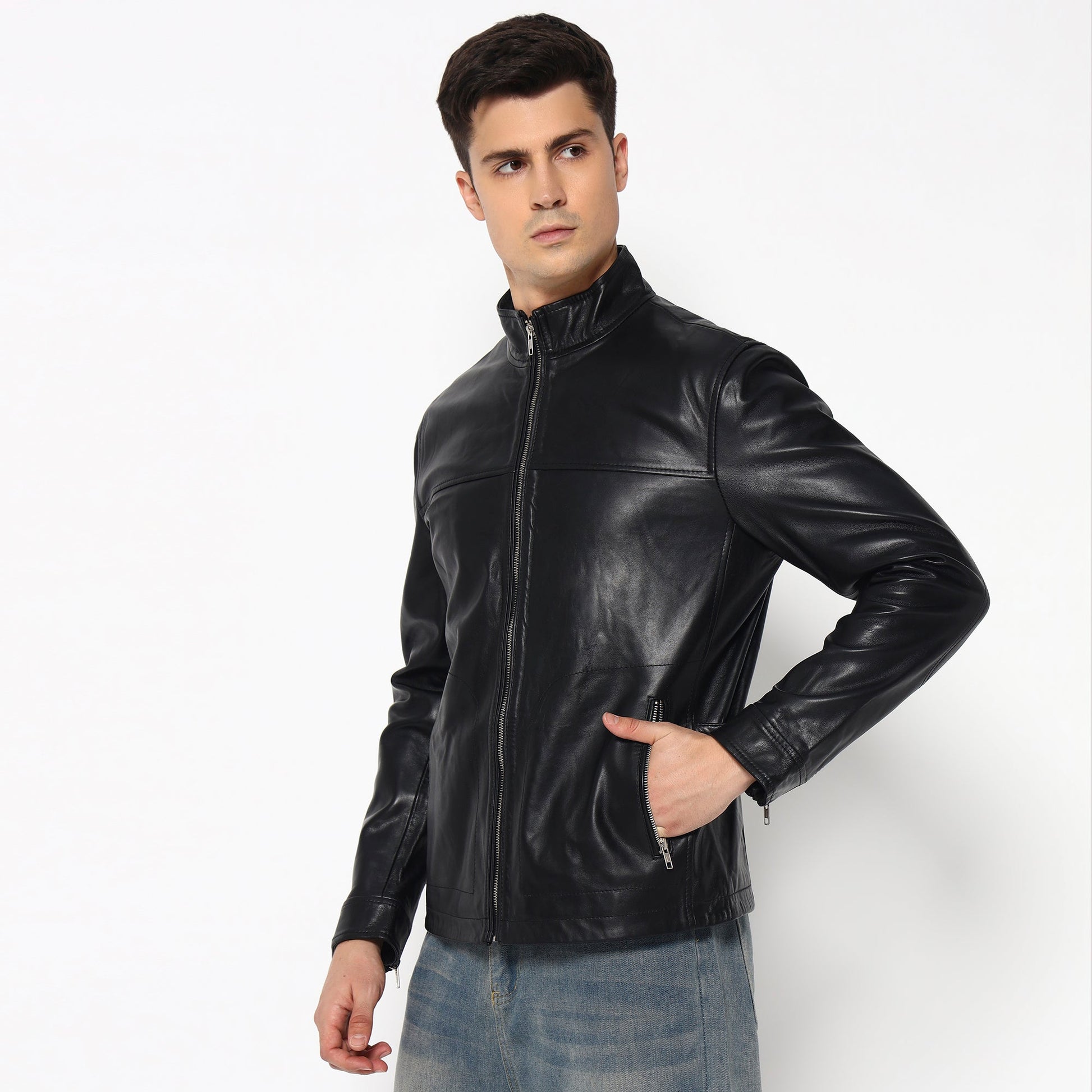 Step up your wardrobe with this Men’s Sleek Black Leather Jacket, a perfect combination of modern sophistication and elegance. Crafted from genuine leather, this bomber jacket features a streamlined outline with a front zip closure, minimalistic panel detailing, and a stand collar for a sharp, contemporary look.