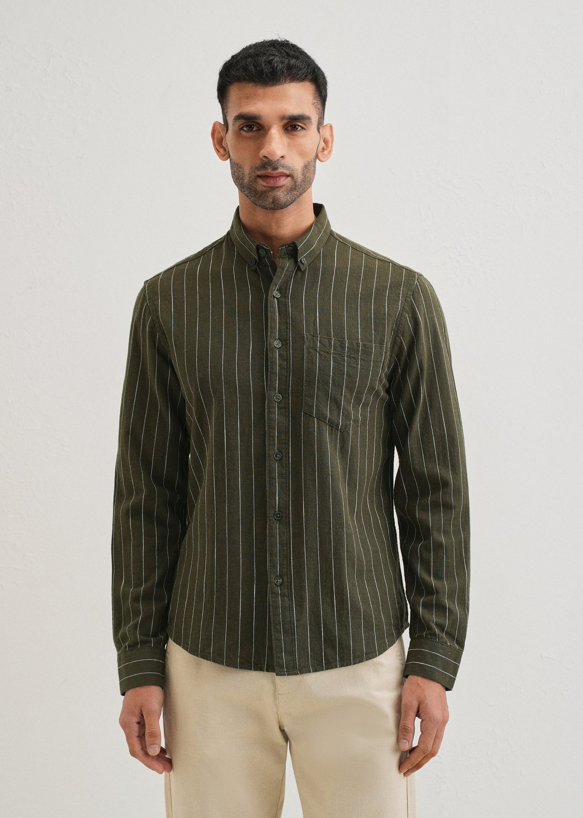 Olive Green Striped Cotton Linen Shirt