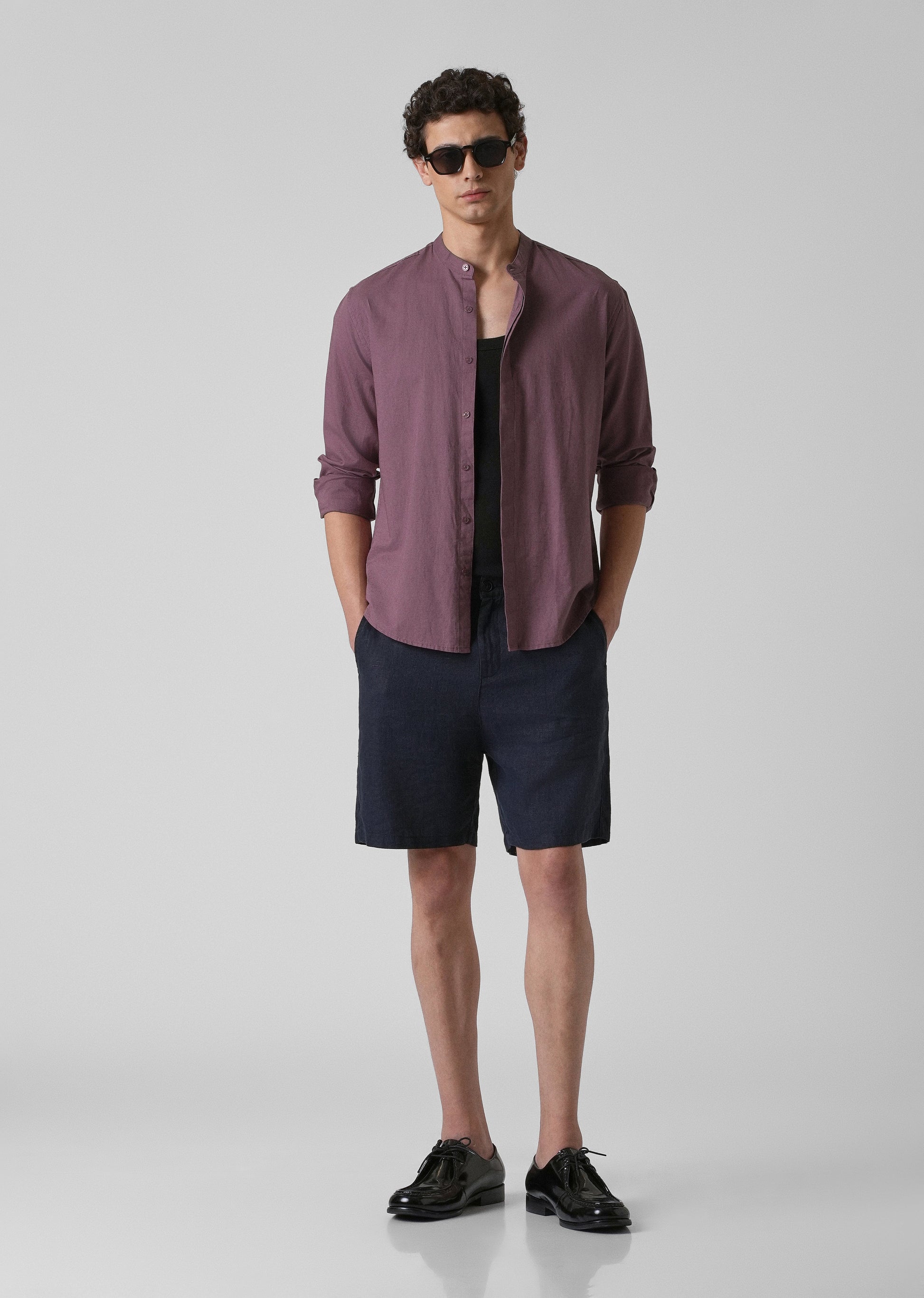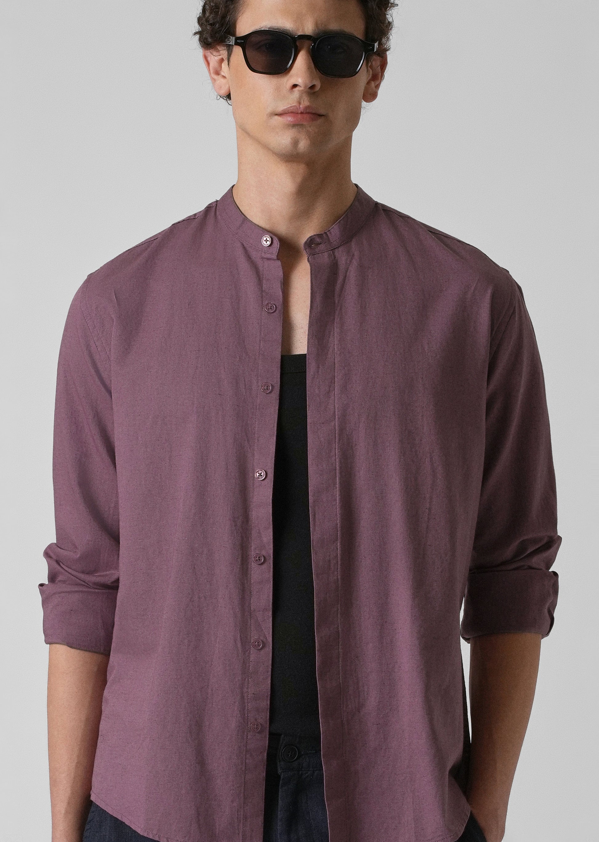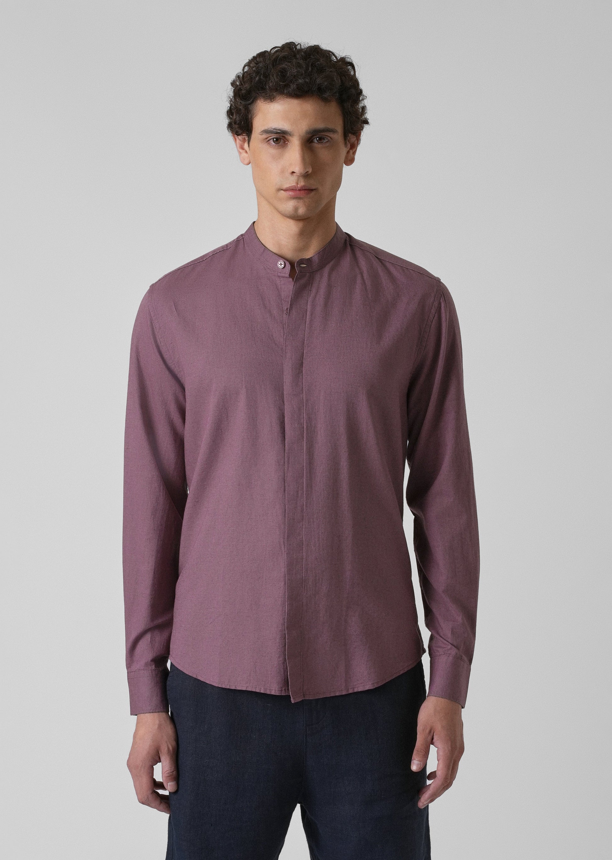 Stay sharp and comfortable with this long-sleeved shirt, designed with a mandarin collar for a clean, modern look. It features a hidden button placket for a smooth, simple front and buttoned cuffs for a neat finish. The regular fit gives you room to move while still looking smart. Made from a light, breathable mix of 68% cotton and 32% linen, it’s a great choice for warmer days and easy, everyday style.