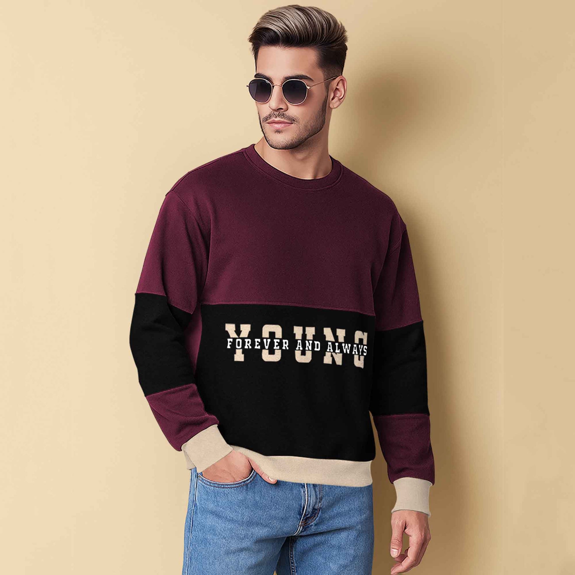 Trendy Round Neck Colorblock YOUNG Printed Maroon & Black Sweatshirt