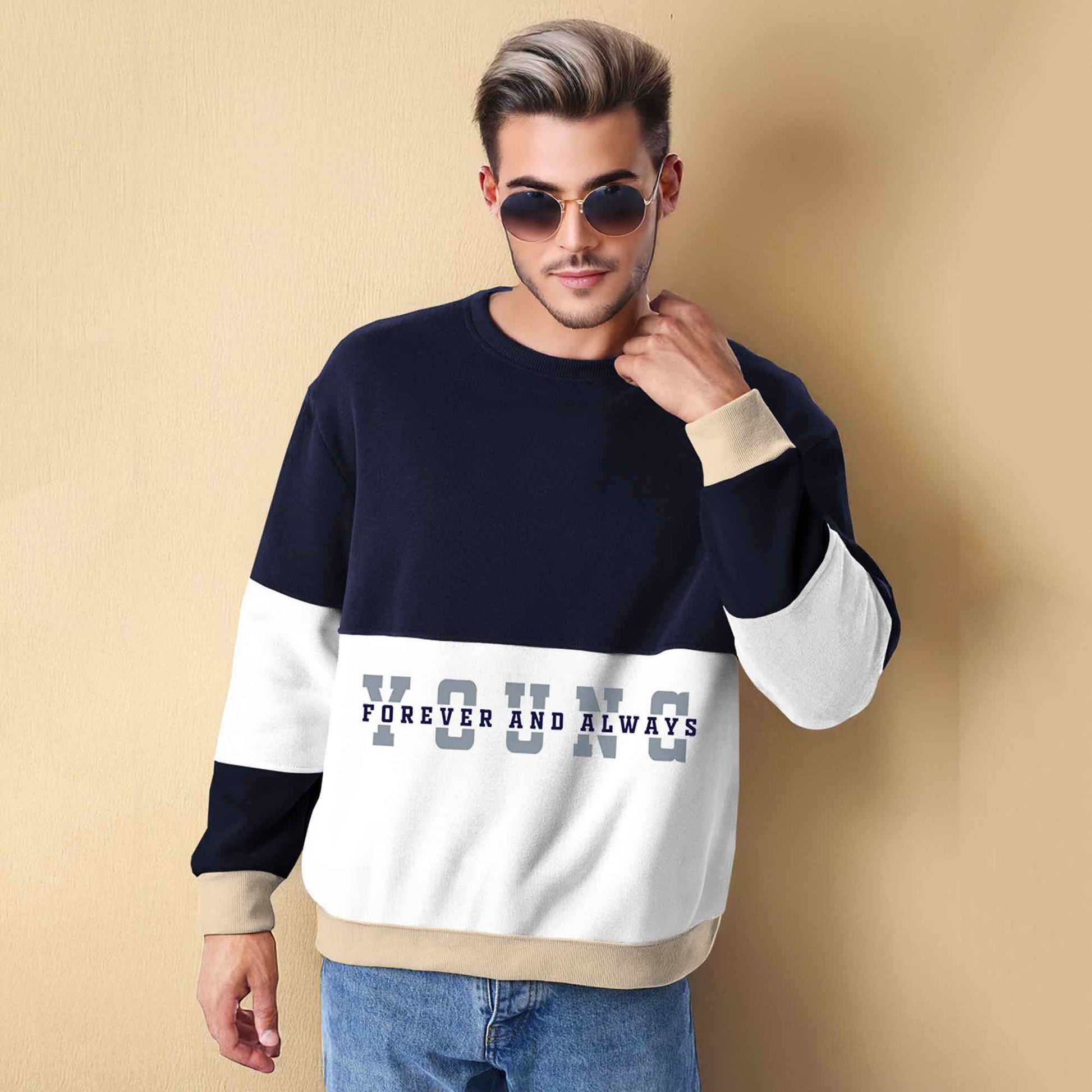 Trendy Round Neck Colorblock YOUNG Printed Navy & White Sweatshirt