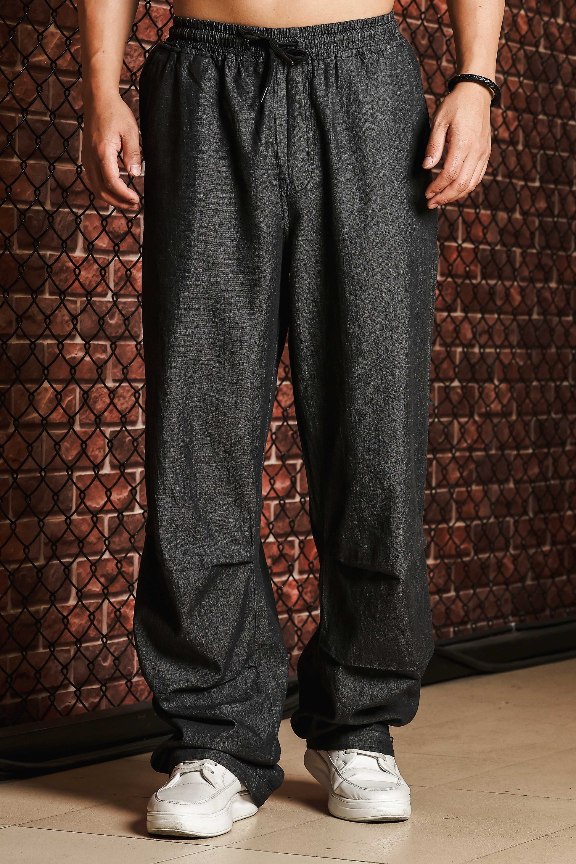 Unisex Charcoal Black Relaxed Fit Drawstring Denim Parachute Cargo