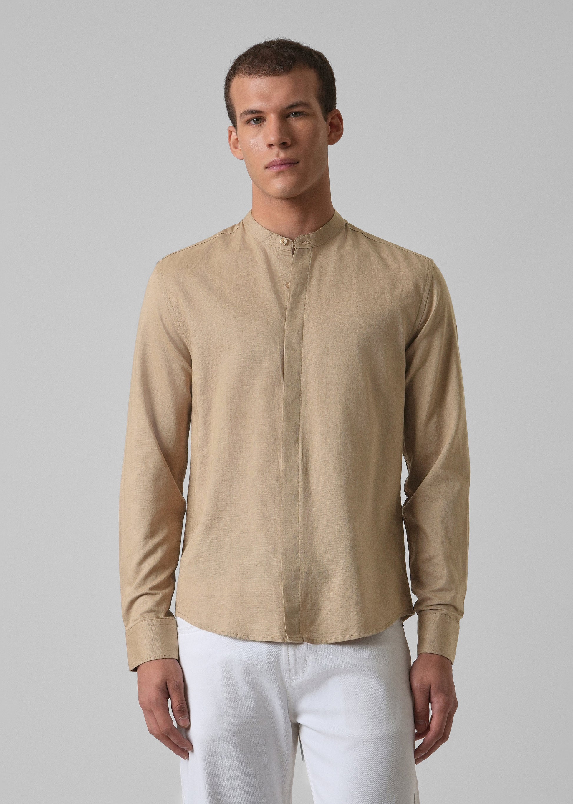Stay sharp and comfortable with this long-sleeved shirt, designed with a mandarin collar for a clean, modern look. It features a hidden button placket for a smooth, simple front and buttoned cuffs for a neat finish. The regular fit gives you room to move while still looking smart. Made from a light, breathable mix of 68% cotton and 32% linen, it’s a great choice for warmer days and easy, everyday style.