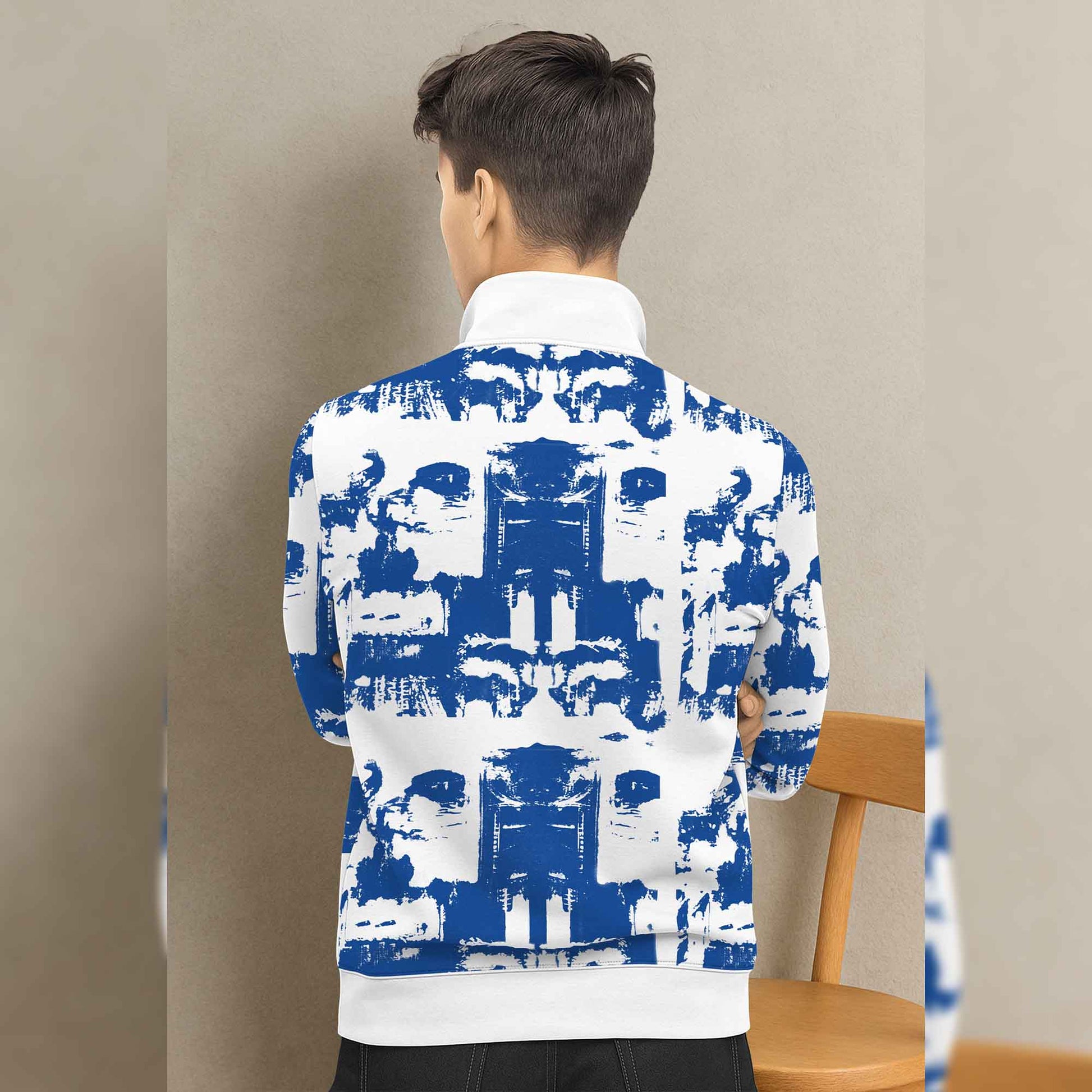 White & Blue High Neck Quarter Zip Up All Over Printed Sweatshirt