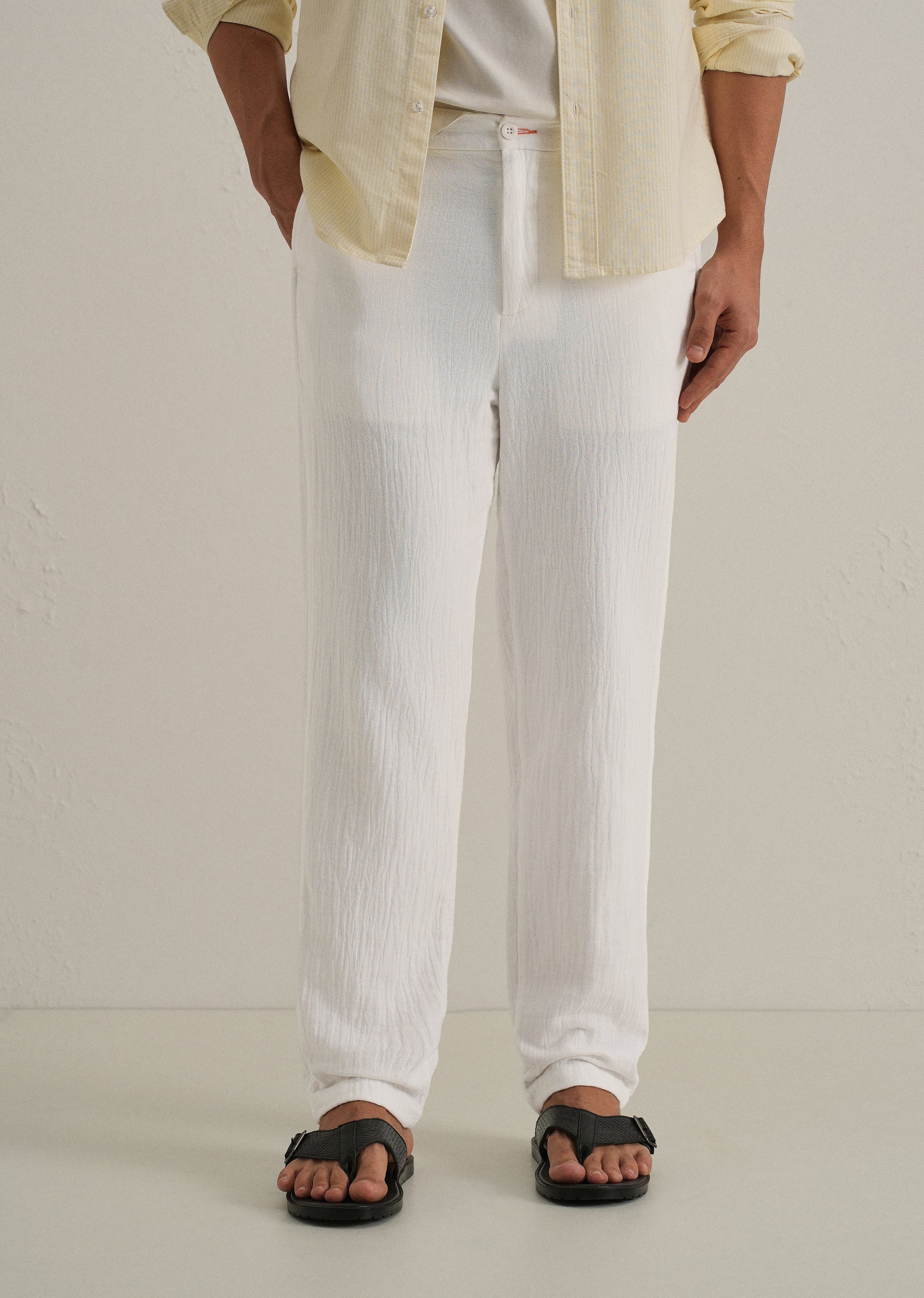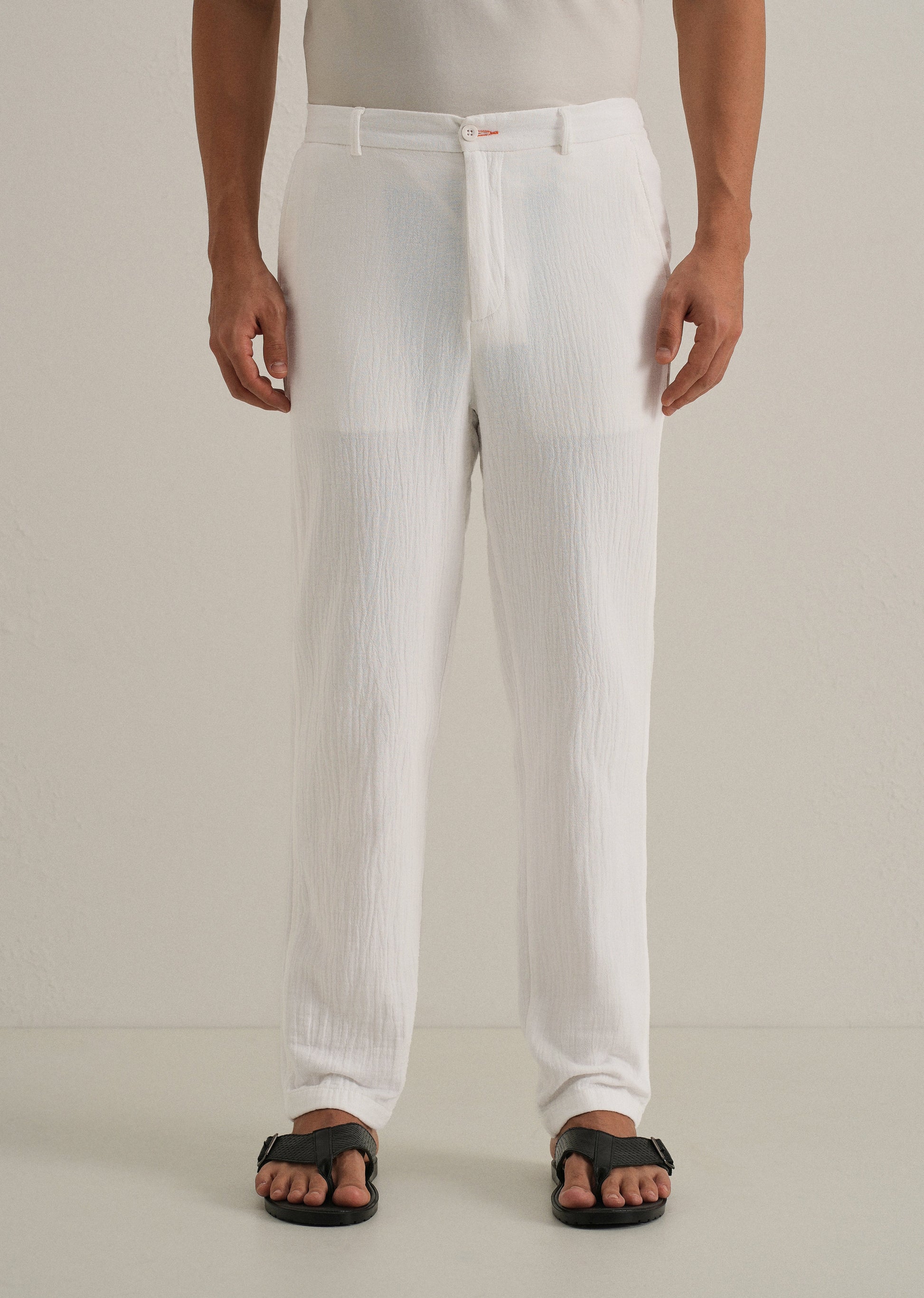 Step into comfort and style with these textured trousers, designed for a perfect balance of comfort and sophistication. Made from lightweight, breathable fabric with a crinkled effect, these trousers feature a mid-rise waist, button-and-zip closure, and belt loops for versatile styling. The straight relaxed fit ensures all-day comfort, while the welt pockets at the back add a clean, tailored finish. These trousers effortlessly blend style and functionality.