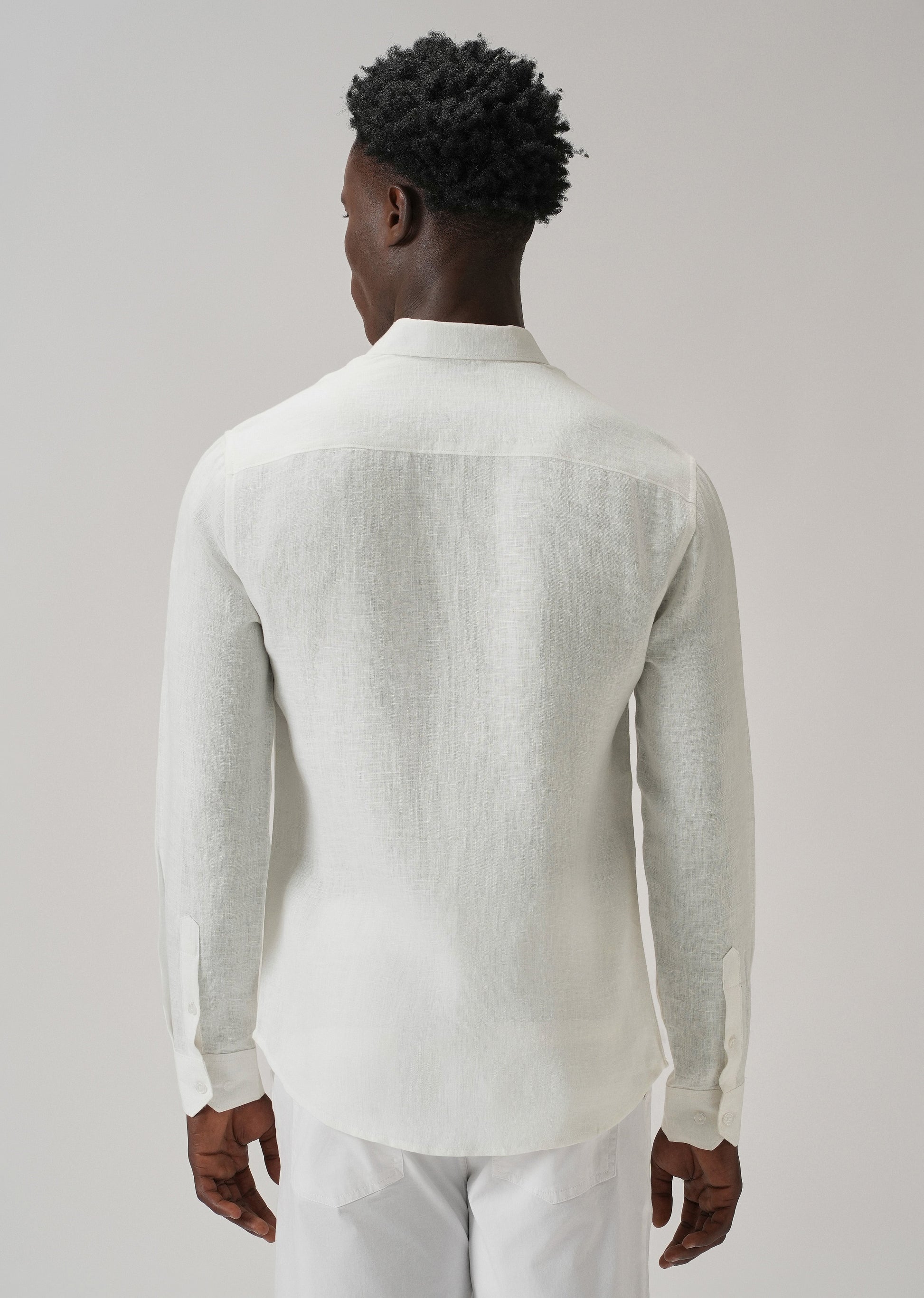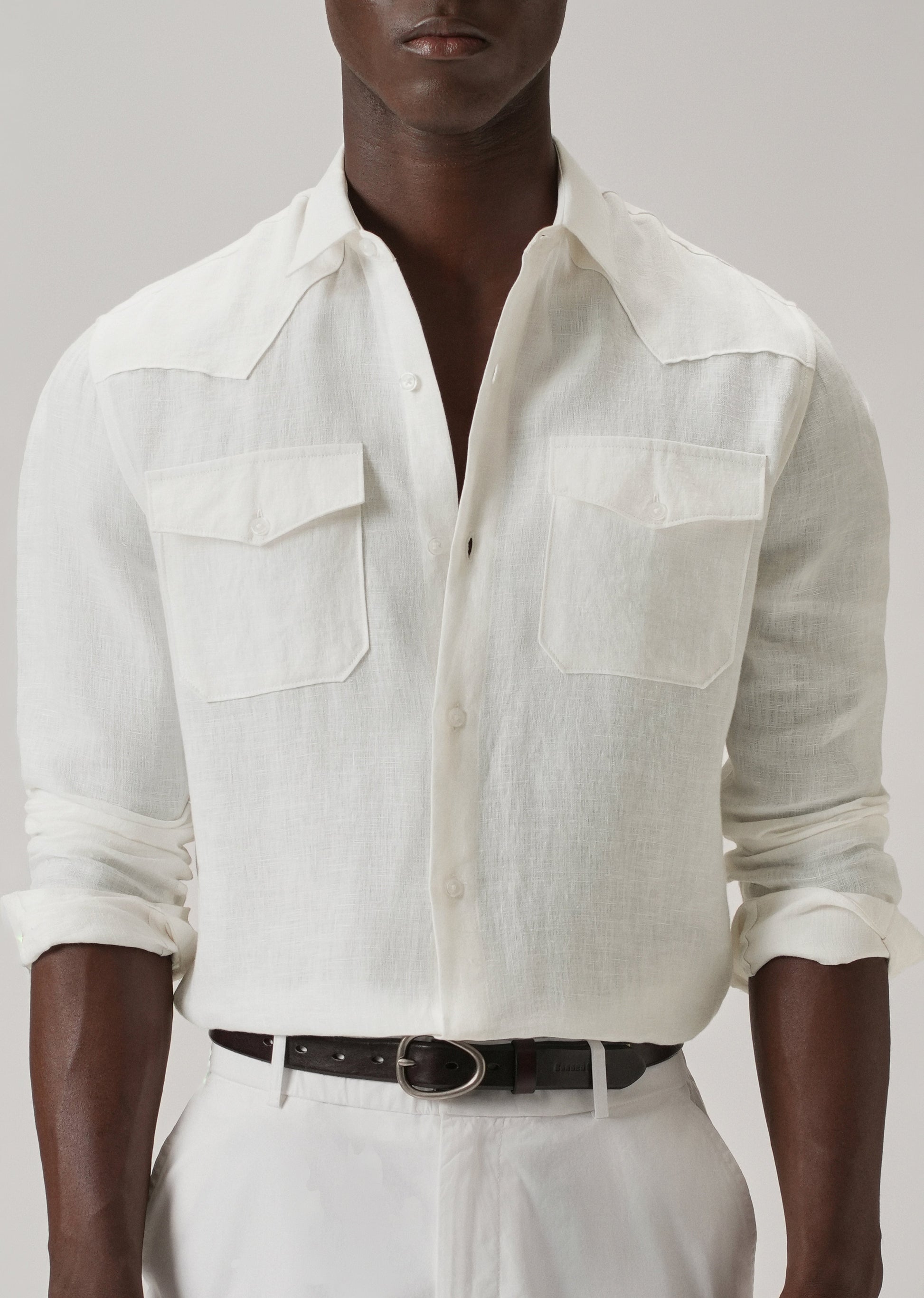 The shirt, crafted from 100% pure Irish linen fabric, has a stylish and casual look with a touch of vintage or Western influence due to the shoulder yokes and chest pockets.