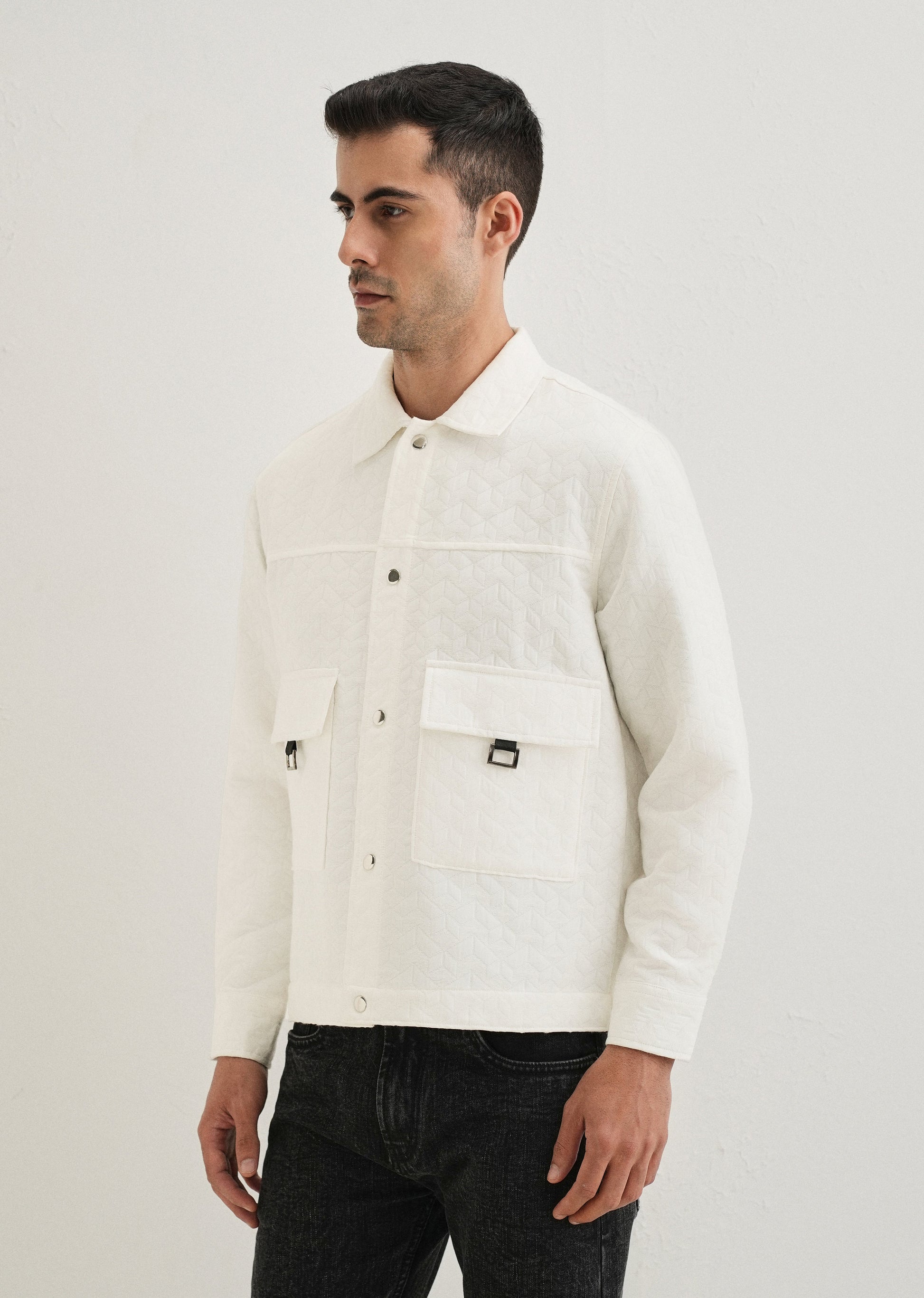 Structured boxy-fit shacket with a standard point collar and straight hem. Made from blended cotton with a geometric textured pattern. Features visible metal snap buttons down the front and two functional flap chest pockets secured with silver snaps for a clean, utilitarian look.