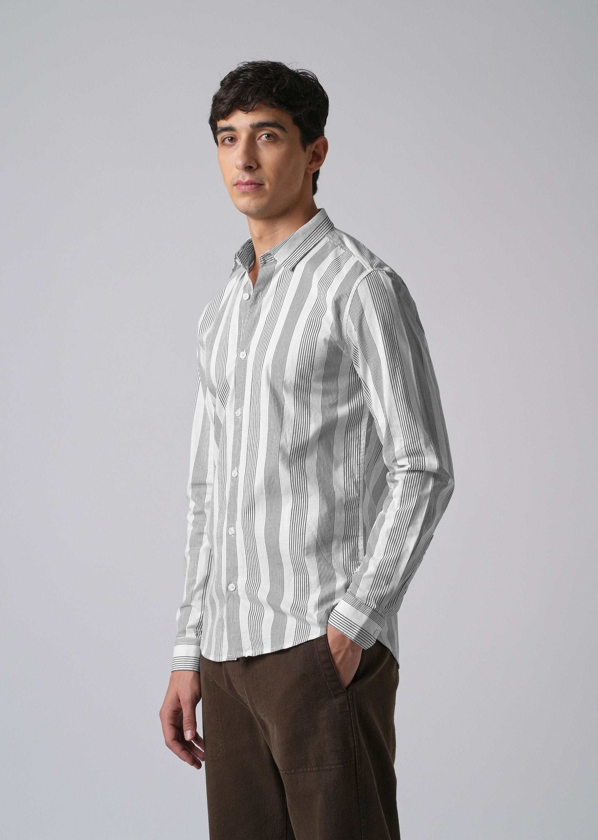The shirt features a pattern of thin, vertical stripes in a light color, it has a classic button-up front with a normal collar and long sleeves. The fit appears to be slim, giving the shirt a modern and eye-catching look.